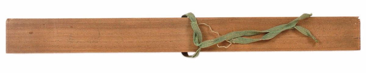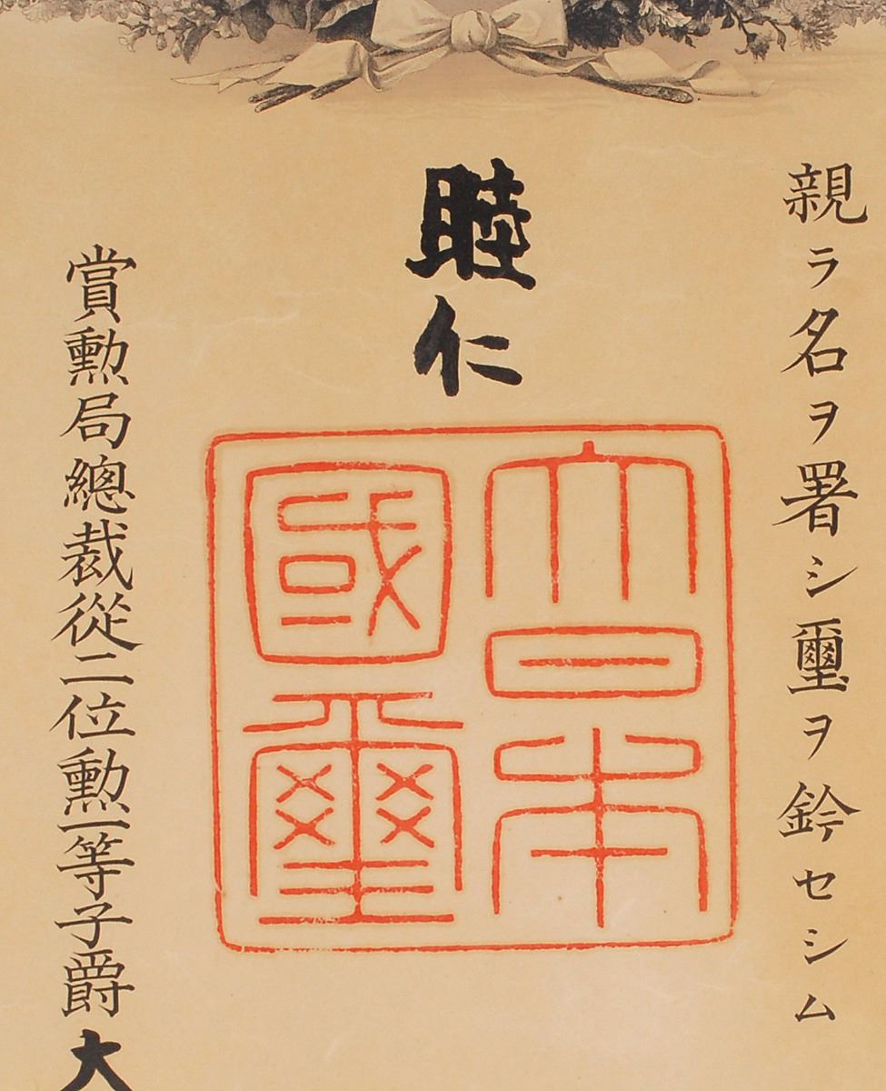 DS in Japanese, one page, 23 x 17.75, circa 1890–1912. Untranslated document in which the emperor of Japan confers the Fifth Class, Order of the Golden Kite upon a distinguished member of the military. Includes its original wooden presentation box with green ribbon. Tightly rolled and in very good condition, with moderate overall toning and scattered creases; one end of the wooden box is absent and the ribbon tie is stretched and frayed.