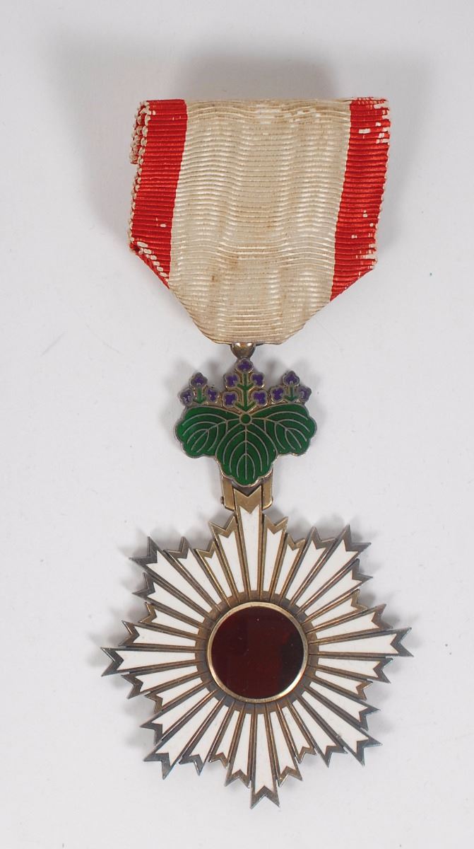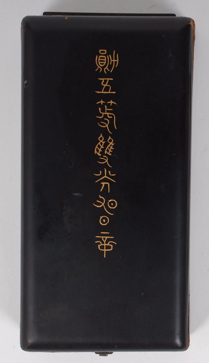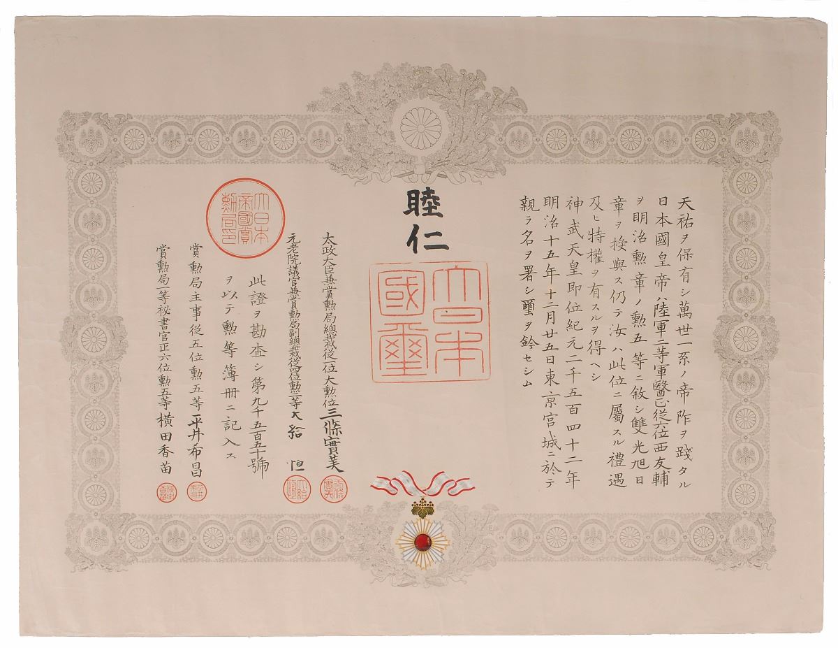 DS in Japanese, one page, 24 x 18.5, circa 1890–1912. Untranslated document in which the emperor of Japan confers the Fifth Class, Order of the Rising Sun upon a distinguished individual. Includes the award medal with black lacquered presentation case. Tightly rolled and in very good condition. Established in 1875 by Emperor Meiji, the Order of the Rising Sun is given to honor those who have made significant achievements in international relations, the promotion of Japanese culture, advancements in their field, development in welfare, or the preservation of the environment. A highly sought-after autograph enhanced by the inclusion of the handsome award medal.