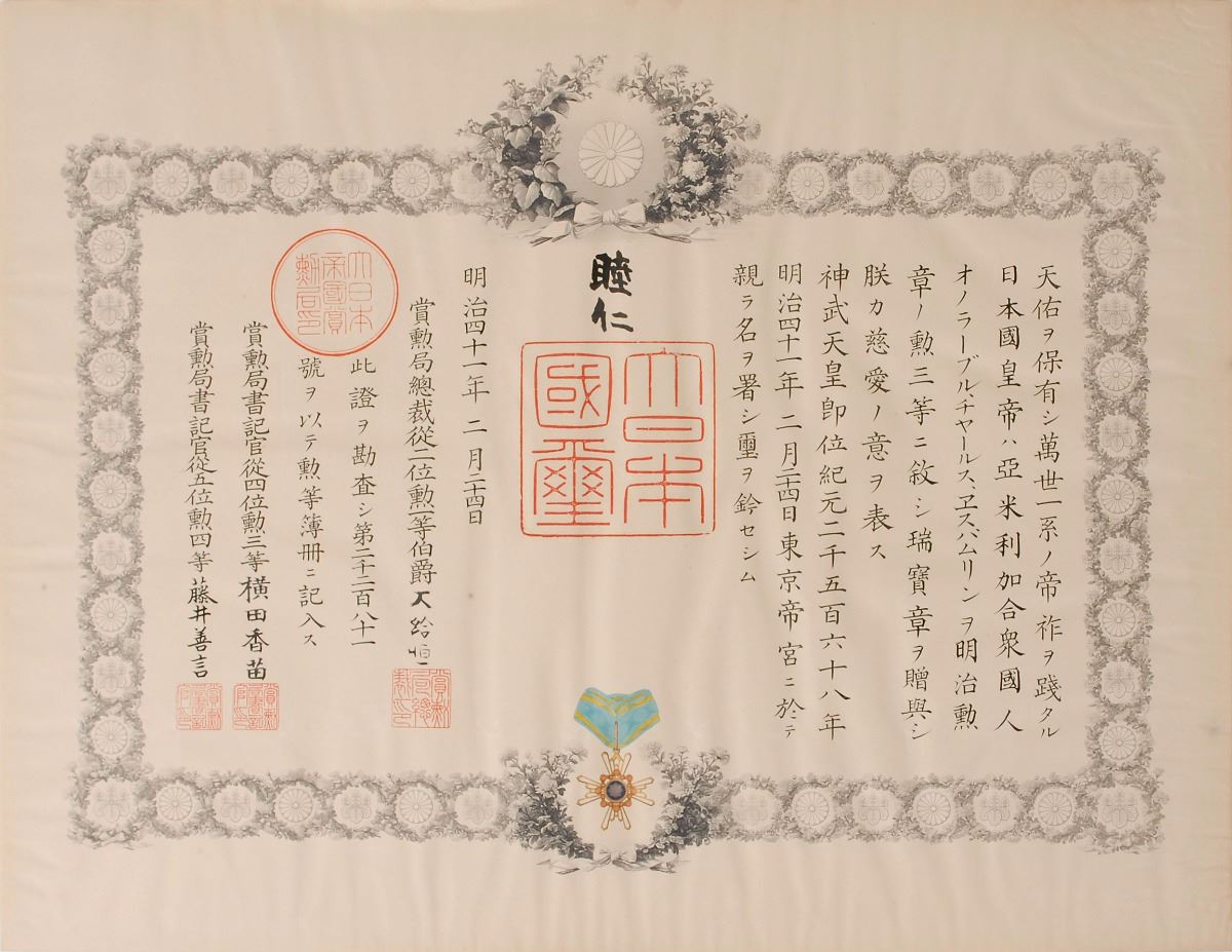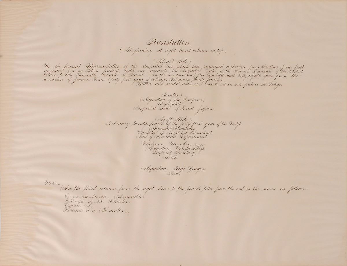 DS in Japanese, one page, 23 x 17.75, February 24, 1908. The emperor of Japan confers the Third Class, Order of the Sacred Treasure upon Charles Sumner Hamlin. In part (translated): "We, the present Representative of the Imperial line, which has remained unbroken from the time of our first ancestor Jimmu Tenno, present, with our regards, the Imperial Order of the Sacred Treasure of the the Third Class to the Honorable Charles S. Hamlin.” In fine condition. Accompanied by an official calligraphic translation.