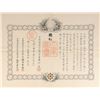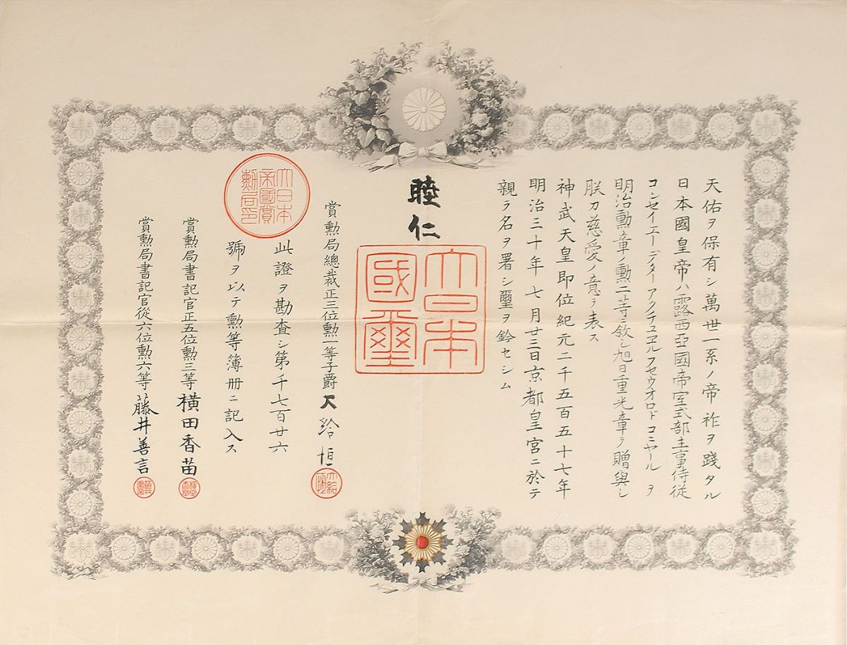 DS in Japanese, one page, 23.5 x 18, March 12, 1897. Untranslated document in which the emperor of Japan confers the Order of the Rising Sun, Second Class, upon Vsevolod Evgenievich Koniar, the Master of Ceremonies of the Imperial Court at St. Petersburg in Russia. In fine condition, with central vertical and horizontal folds; unlike most of these documents, this example does not appear to have been rolled. Established in 1875 by Emperor Meiji, the Order of the Rising Sun is given to honor those who have made significant achievements in international relations, the promotion of Japanese culture, advancements in their field, development in welfare, or the preservation of the environment. Pre-certified PSA/DNA.