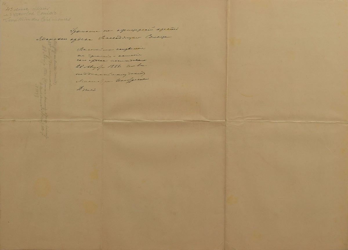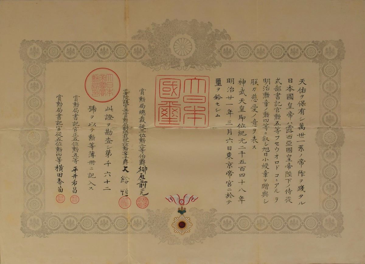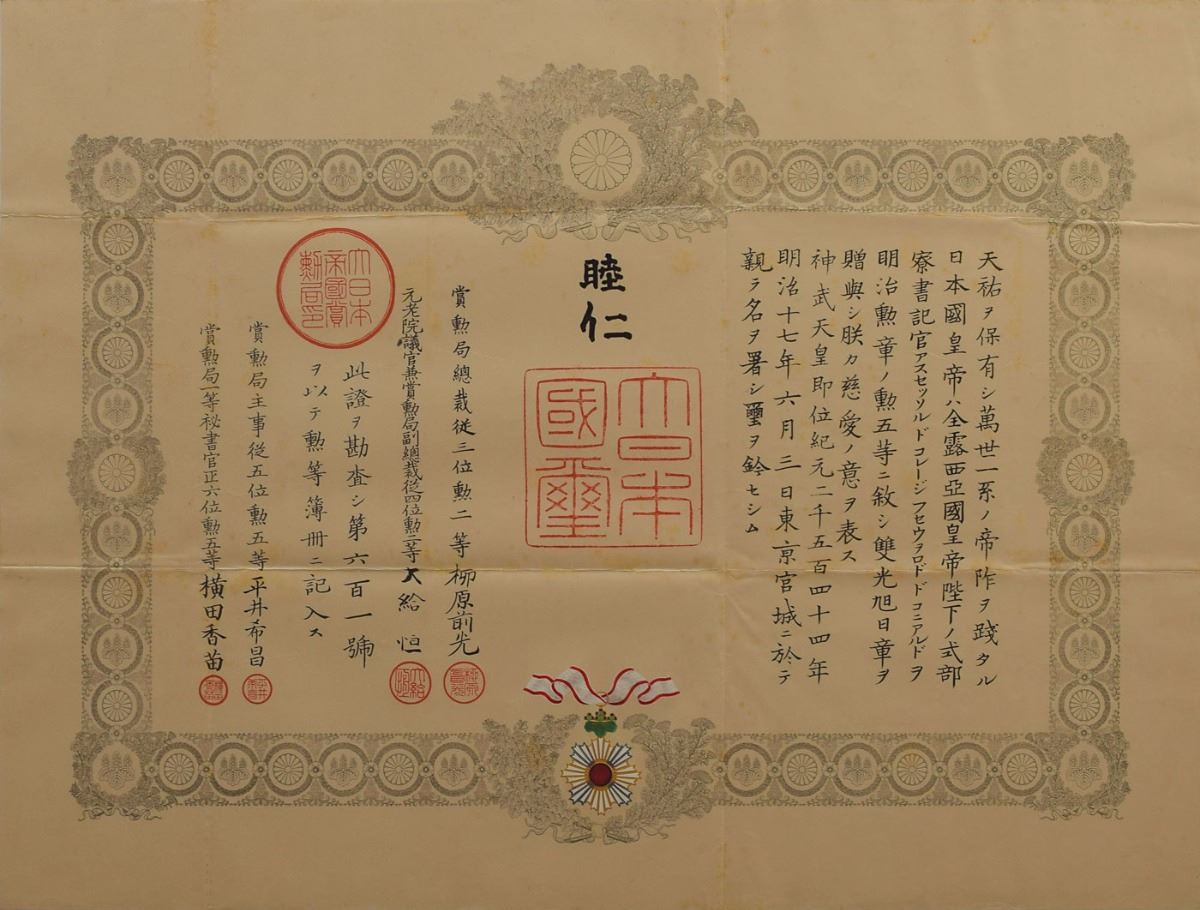 DS in Japanese, one page, 24.25 x 18, no date. Untranslated document in which the emperor of Japan confers the Order of the Rising Sun, Fifth Class, upon Vsevolod Evgenievich Koniar, the Master of Ceremonies of the Imperial Court at St. Petersburg in Russia. Reverse is annotated in Cyrillic. Also includes an unsigned certificate awarding the Order of the Rising Sun, 4th Class, in 1888. In very good to fine condition, with scattered foxing to the signed document. Established in 1875 by Emperor Meiji, the Order of the Rising Sun is given to honor those who have made significant achievements in international relations, the promotion of Japanese culture, advancements in their field, development in welfare, or the preservation of the environment.