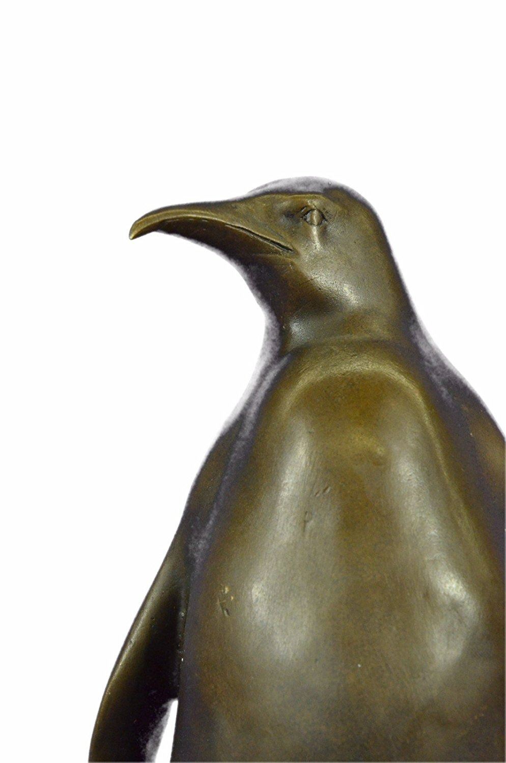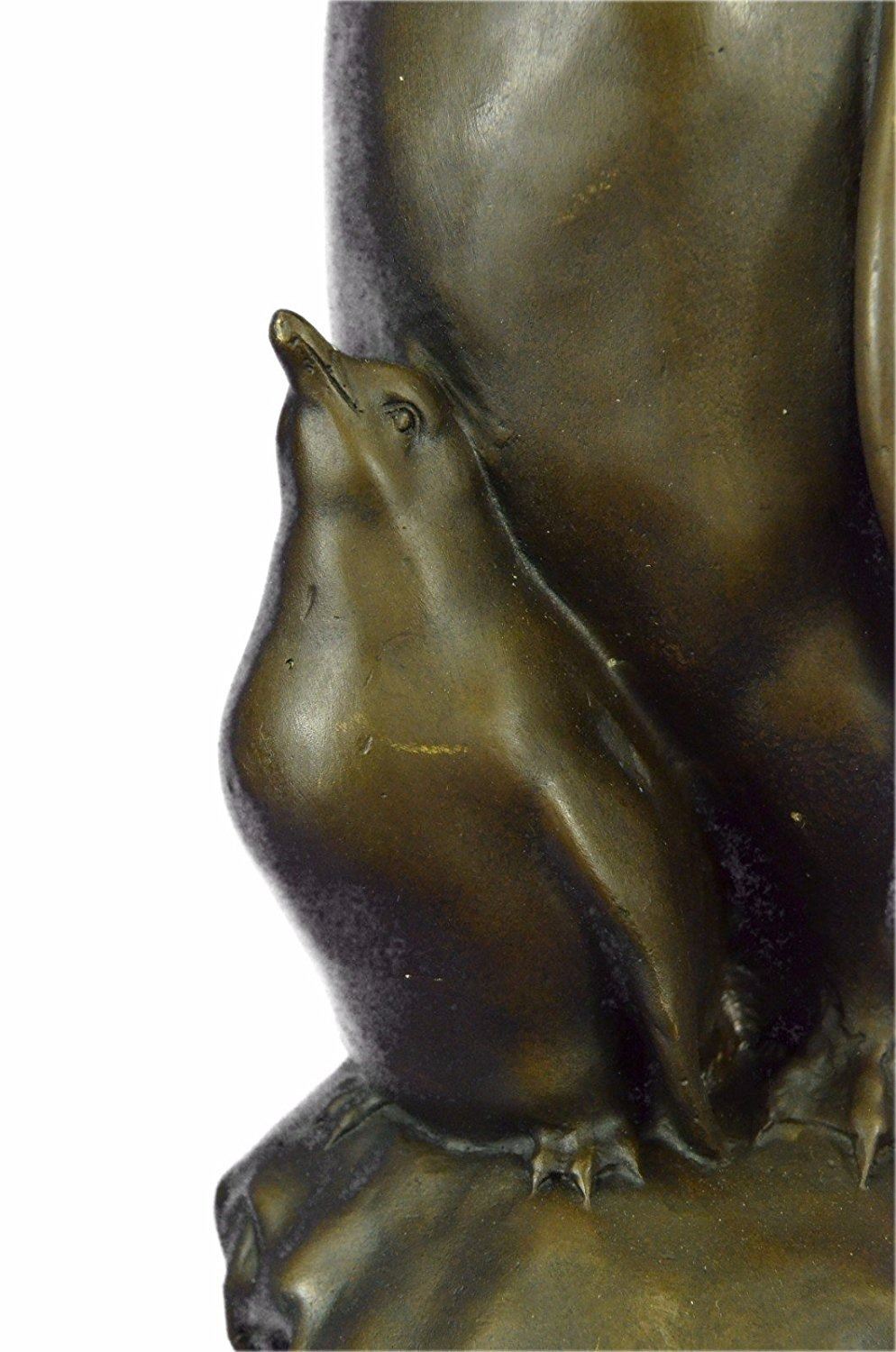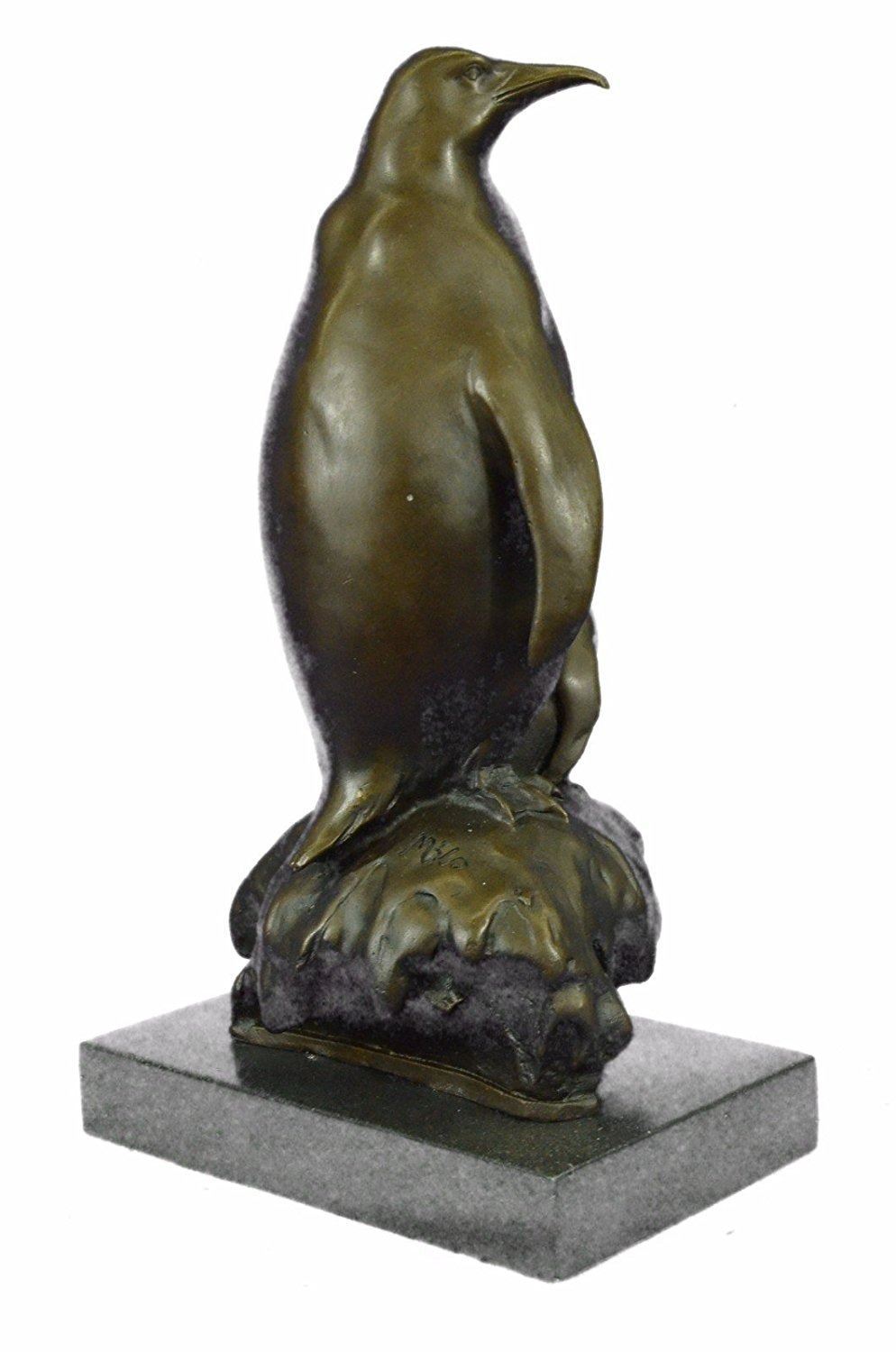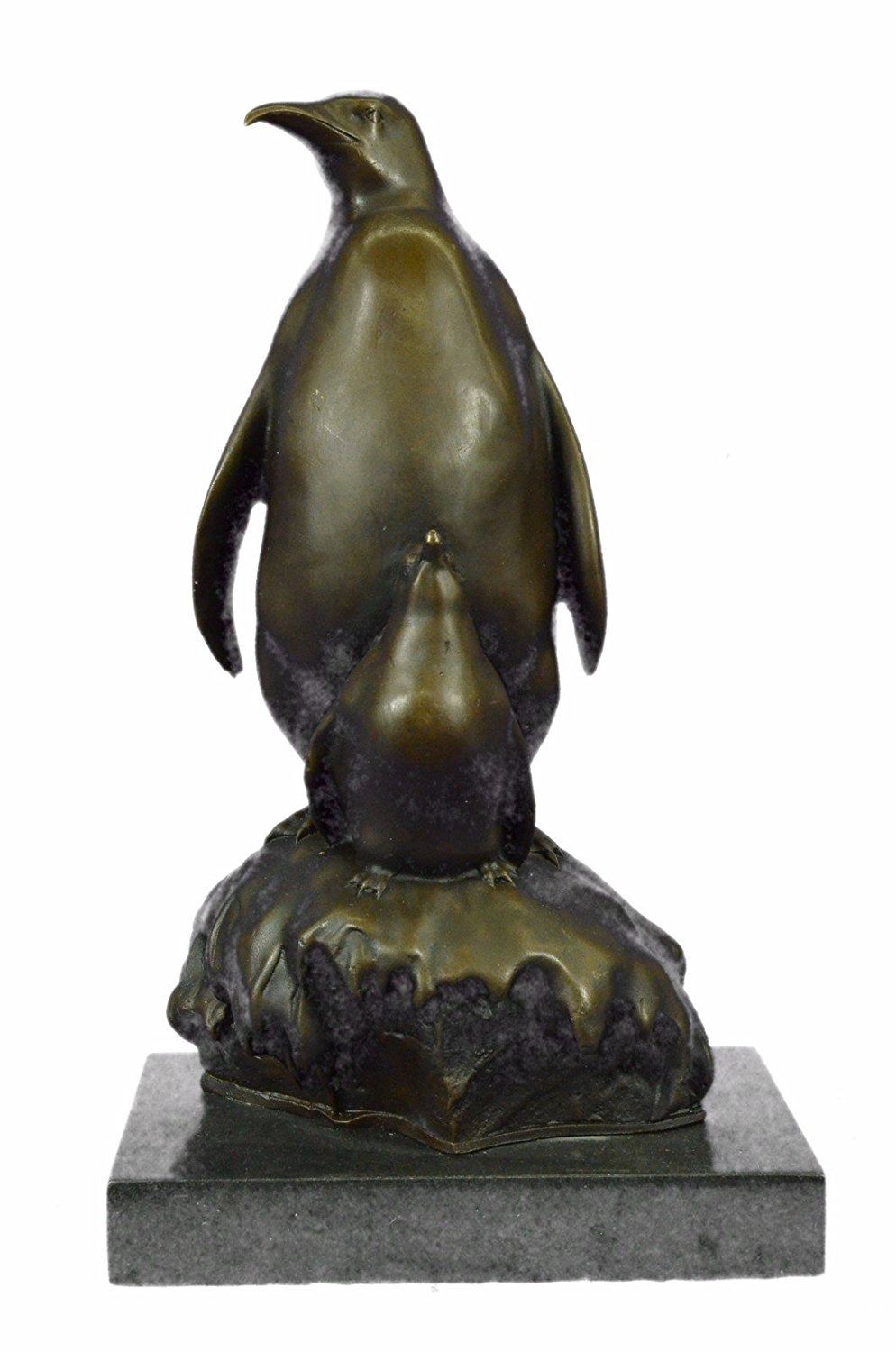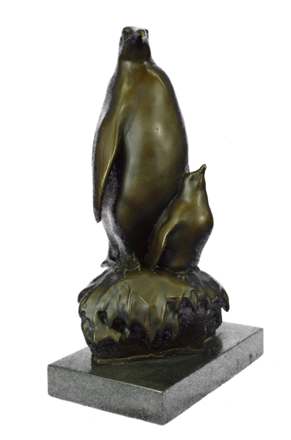 A Mommy penguins snuggle close to her babyto shield him away from theAntarcticacold. She stand tall next to her baby. 100% bronze and handmade, this brown patina sculpture was cast using the Lost Wax Method and mounted on a marble base. Bronze Dimensions with Marble Base: Height 14 X Width 8 inches. Weight: 15 LBS. Inventory: 63Y4056136