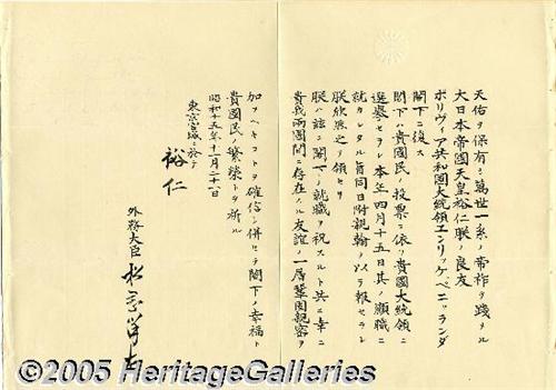<B>Emperor of Japan Hirohito Signs a Gorgeous Diplomatic Letter to the New President of Bolivia, Enrique Penaranda</B></I> Emperor of Japan, Hirohito (1901-1989) acceded in 1926 and his reign was marked by rapid militarization and aggressive wars against China and the United States. World War II ended with the dropping of the atomic bombs on Hiroshima and Nagasaki. In 1946, he renounced his divinity in favor of a democratic constitutional monarchy. Document signed, two pages, November 21st, Tokyo. The document shows clear, large symbols and a wonderful dark signature. It reads, in part, "...To His Excellency Mr. Enrique Penaranda... it is with great pleasure that we have received... to inform us that after being elected Constitutional President of the Republic of Bolivia... sending to His Excellency our congratulations at the occasion of His taking office, we are convinced that the good ties existing between our Two Countries will be even closer..." Countersigned by Yosuke Matsuoka, Minister of Foreign Affairs. In 1998 similar letters fetched around $50,000 at auction. <I>Accompanied by COA from PSA/DNA.</B></I>