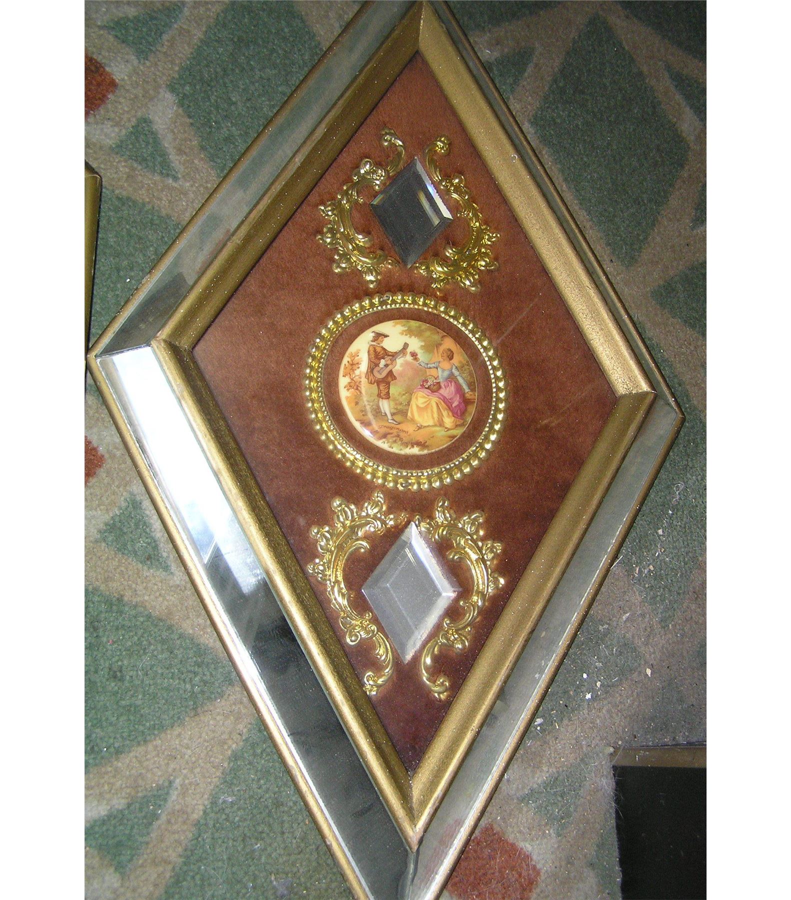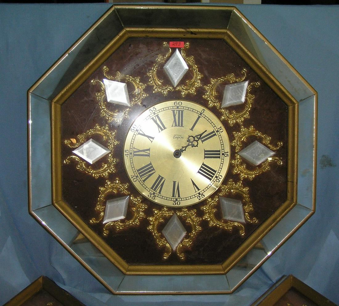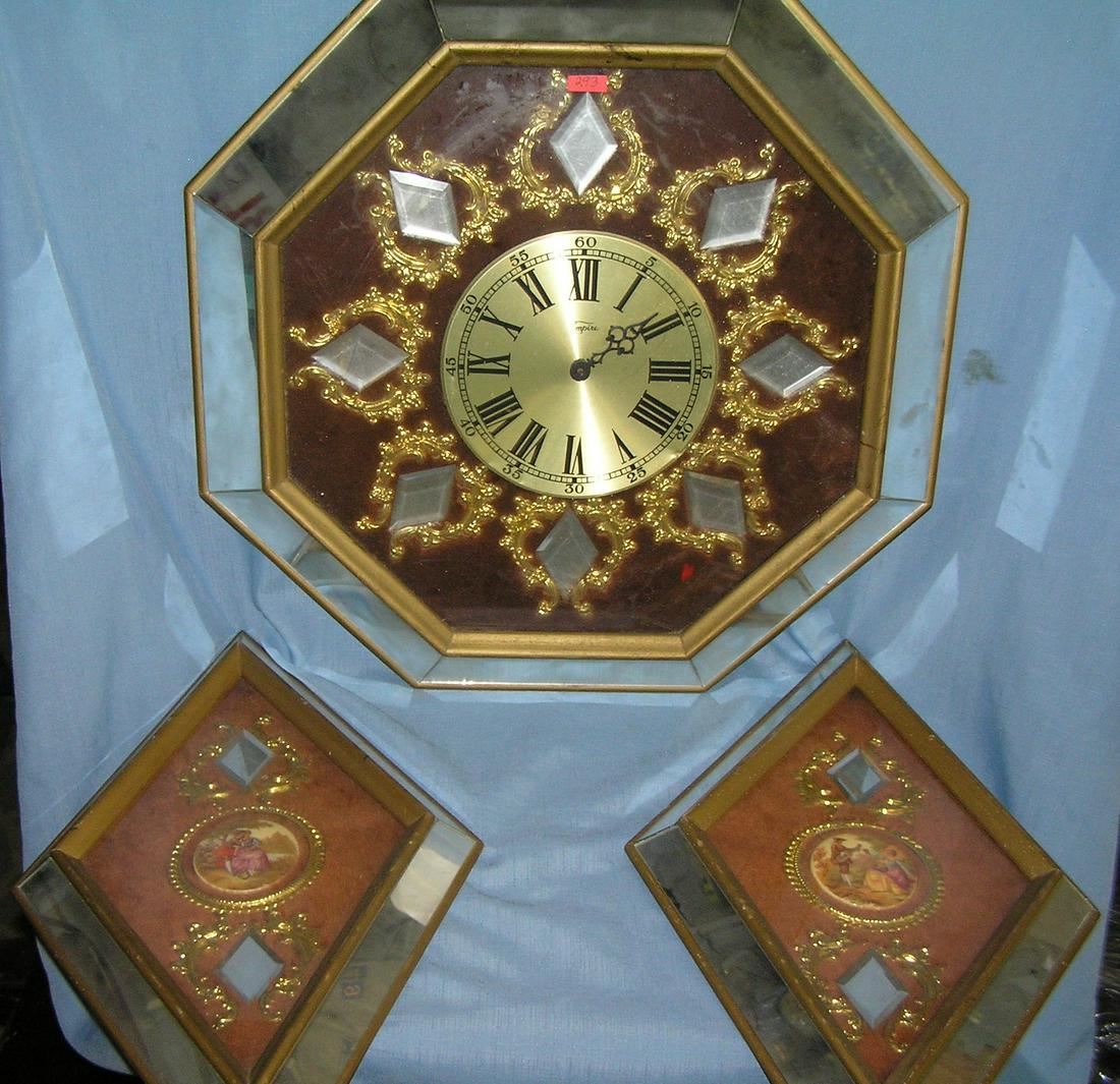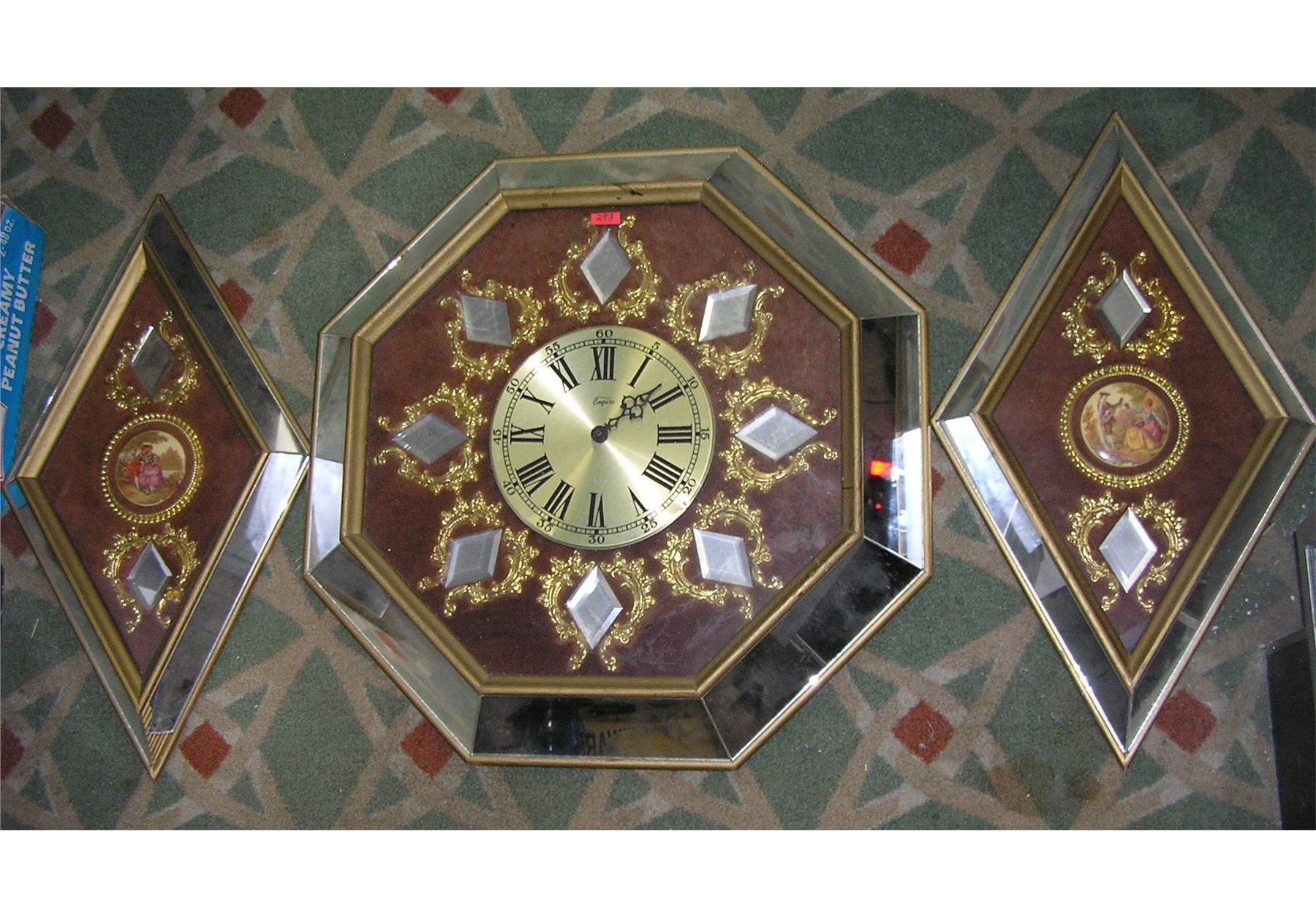 Empire brand 3 piece Mid Century modern decorative wall clock with 2 adjoining diamond shaped decorative wall plaques with Limoge inserts all trimmed in gold with multiple decorative mirrored glass diamond shaped pieces and trim mfg by Empire Art Products of Glendale NY circa 1950's/60's est. value $300.00-$400.00
