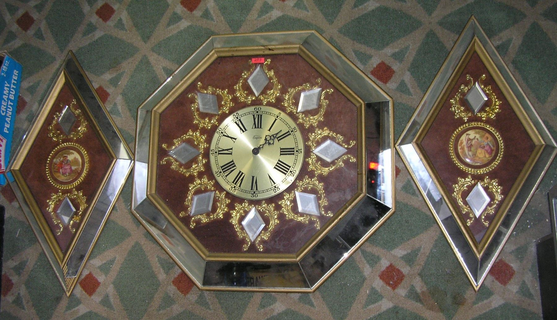 Empire brand 3 piece Mid Century modern decorative wall clock with 2 adjoining diamond shaped decorative wall plaques with Limoge inserts all trimmed in gold with multiple decorative mirrored glass diamond shaped pieces and trim mfg by Empire Art Products of Glendale NY circa 1950's/60's est. value $300.00-$400.00
