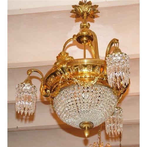 A beautiful Empire 4 L Chandelier, the piece has been restored using the original Baccarat crystal beads, and Bohemia lead crystal spikes, it is in very good conditions, clean , ready to hang, rewired for US use. Stands 27 inches H and 23 inches wide,