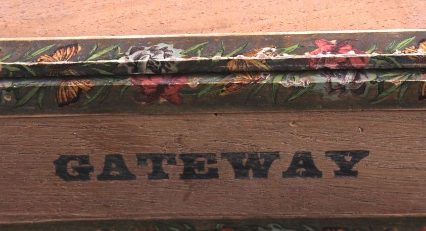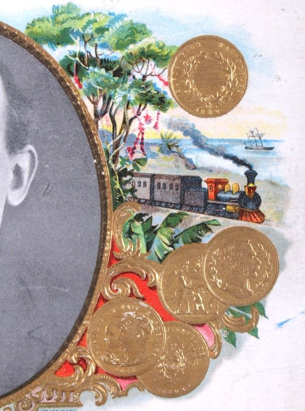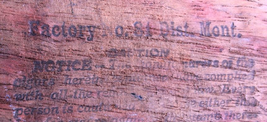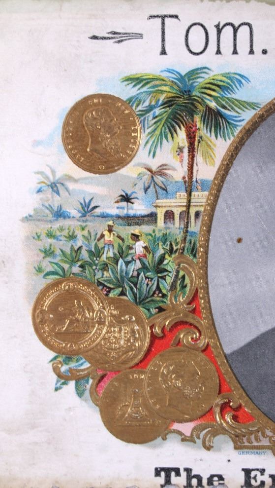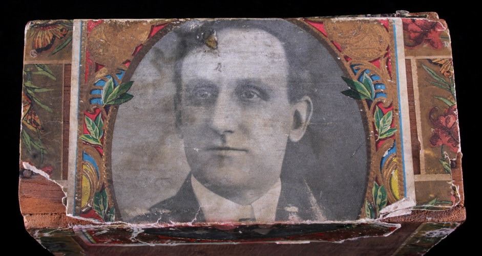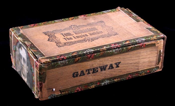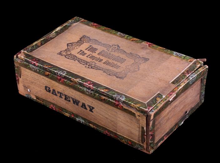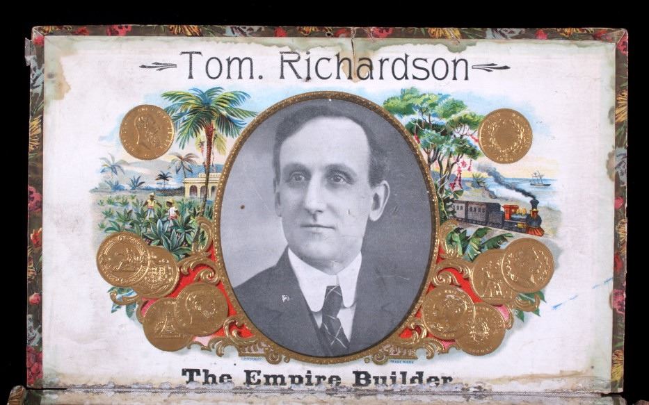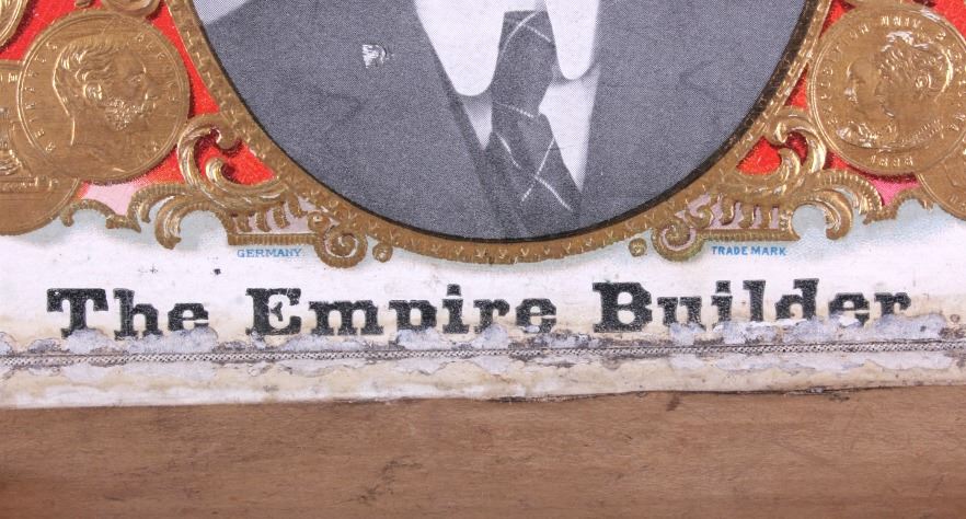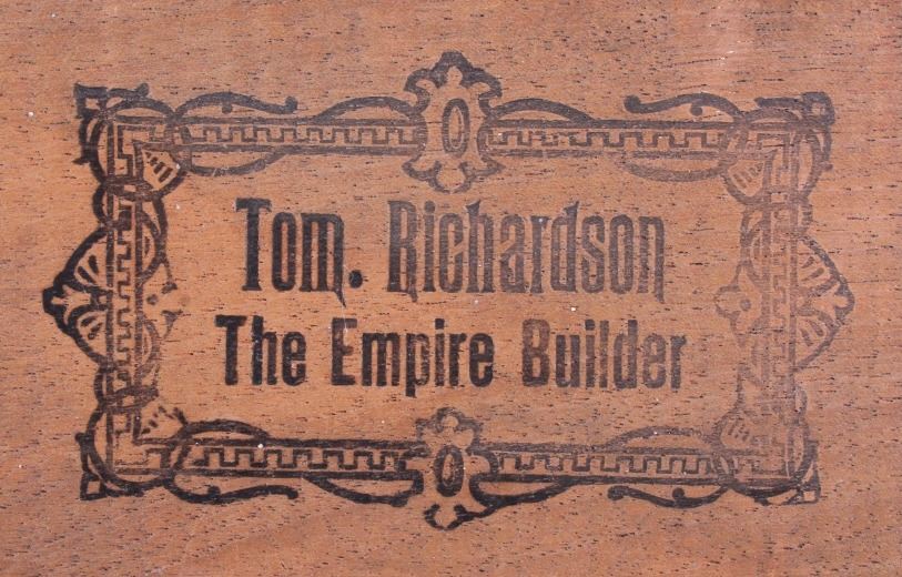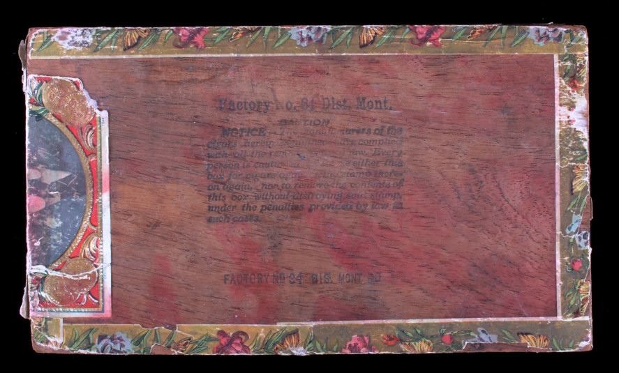 This is an Empire Builder cigar box from Montana. The inside of the box shows a unique lithograph image of Tom. Richardson as well as a plantation and train scene. The bottom of the box is marked "Factory No. 81 Dist. Mont.". The cigar box is in good overall condition with some wear and damage as shown. The box measures 5.25" x 9" x 2.75".
