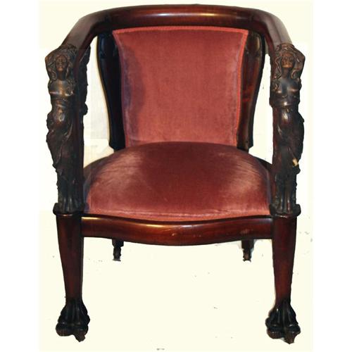 Empire chair with intricately carved arms depicting a a woman with long flowing hair. Claw feet. Tastefully upholstered in rose velvet