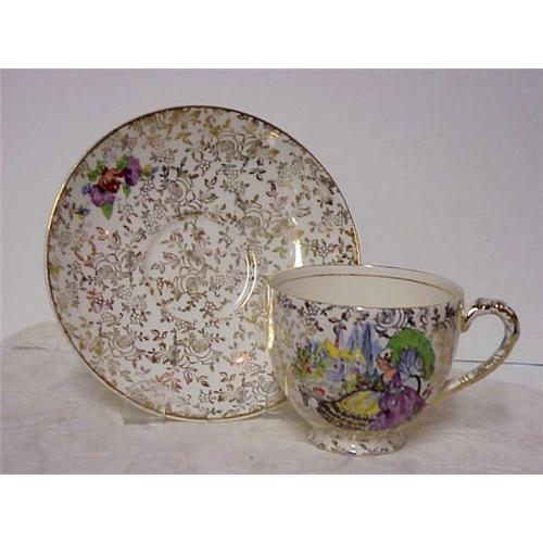Very pretty antique cup and saucer - Made by Empire - England - Gorgeous golden chintz pattern adorned with beautiful Victorian Lady in the garden - Please note tiny bow on the top of the handle - Very good condition - Free of chips or cracks - U.S. buyer to pay 7.00 for shipping plus insce if desired - Please