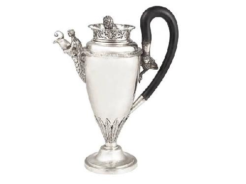 Silver, 797 g. The empire variation of an ancient Roman can. Round, profiled base, cast and chiselled lance-shaped leaves, amphora like elegant body. Rolled palmette frieze at the shoulder. The spout is depicting a Roman boy in tunic holding a jug. Shaped original wooden handle with cast birds. Detachable cover with pierced rim with stylised foliate motif ornamentation. The final is a sitting lion. Minor restorations. Marked: Augsburg, circa 1810, tax stamp fro Prague 1810-1821, Johann Alois Seethaler and Christian Friedrich Temmler. Seling: 297, 2637, 2638 Comment: Seethaler and Temmler became masters in 1796, more of their mutual works are known. Literature: Alain Gruber: Weltliches Silber, Zürich, Schweizerisches Landesmuseum pictures 346-347 (the counterparts of this lot) Size: 26 cm