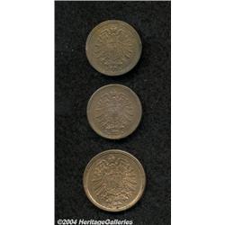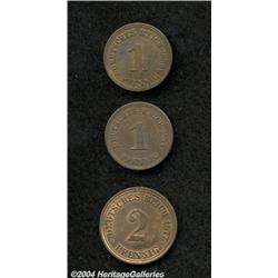 <B>Empire Lot of Three Coins,</B></I> KM1 One Pfennig 1886F AU and 1888D AU; KM2 2 Pfennig 1877A BU. 3 coins <BR><BR><B>Important notice:</B> Heritage usually auctions material at the rate of 200-250 lots per hour. On some occasions eBay Live bid software or the Internet may not be able to keep up with the pace of the auction. We recommend placing a realistic absentee bid now as insurance to avoid disappointment. Occasionally the auctioneer may eliminate or reject an eBay Live bid, and the auctioneer may also reopen a lot after the close of the eBay live bidding (usually because we missed an audience bid), and may reject your bid even if it shows you as the winning bidder. By bidding via eBay Live, you agree that Heritage may award the lot to another bidder at its sole discretion under the circumstances described above or any other reasonable circumstances. Since eBay bids are not shown to us until we open the lot on the floor, we treat those bids just like floor bids. In most cases the floor responds before the eBay bid is presented to us, due to Internet lag time, so for consistency we have made it a policy that floor bids are always considered first over tie eBay live bids. Also please note that all Heritage lots purchased through eBay Live carry a 20% Buyer's Premium. Please make sure you read the Terms and Conditions before you bid.