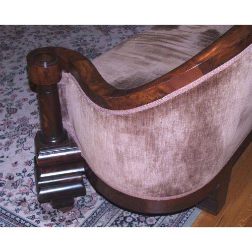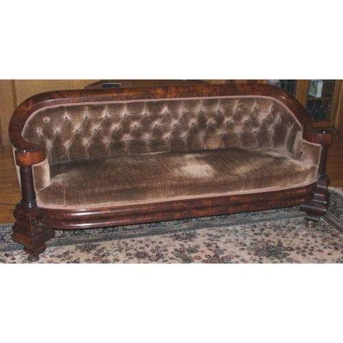 American. Empire or Classical. 19th century. Mahogany. Classical style sofa with a carved crest rail, scrolled arms with column supports above bombe feet and an ogee rail. 33" high X 77" long.