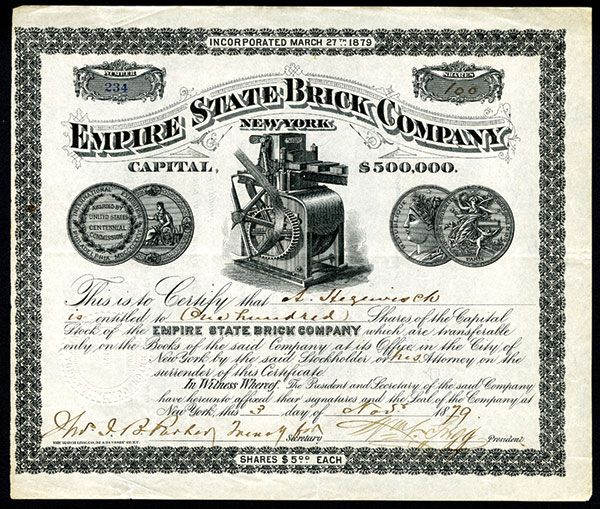 New York. 1879. 100 I/U Stock. #234. Black print with black border and underprint. Vignette center of brick manufacturing machine. VF condition with minor split on bottom border, Hatch Lith Co.