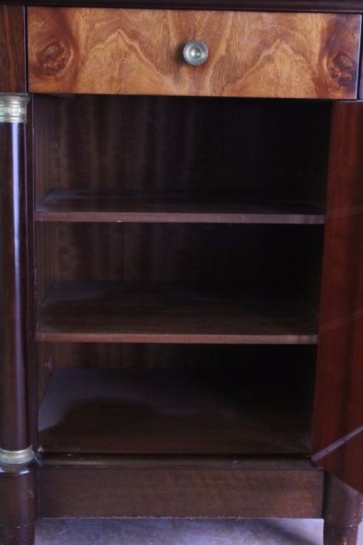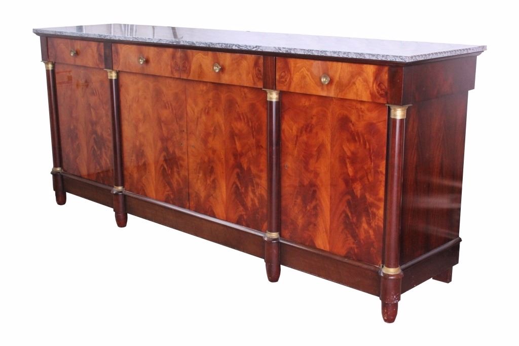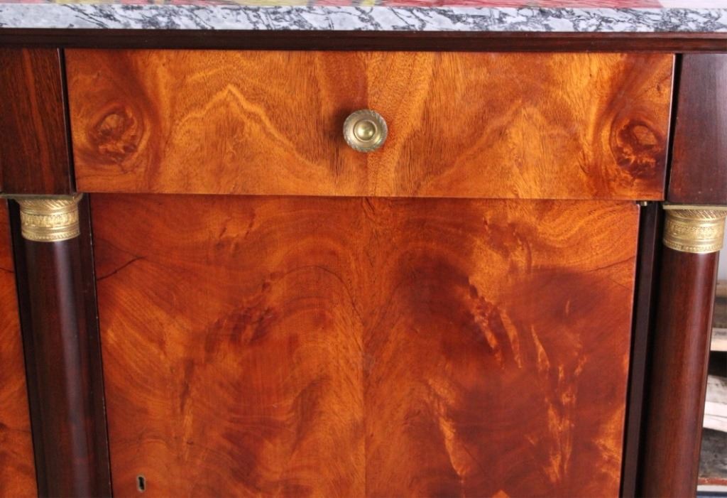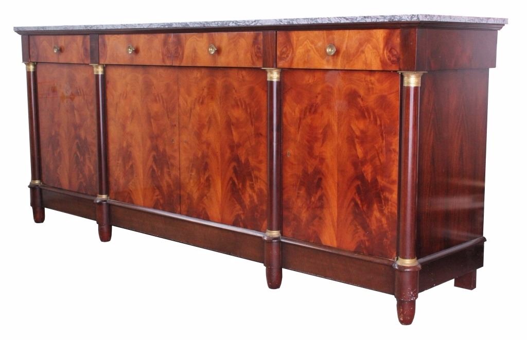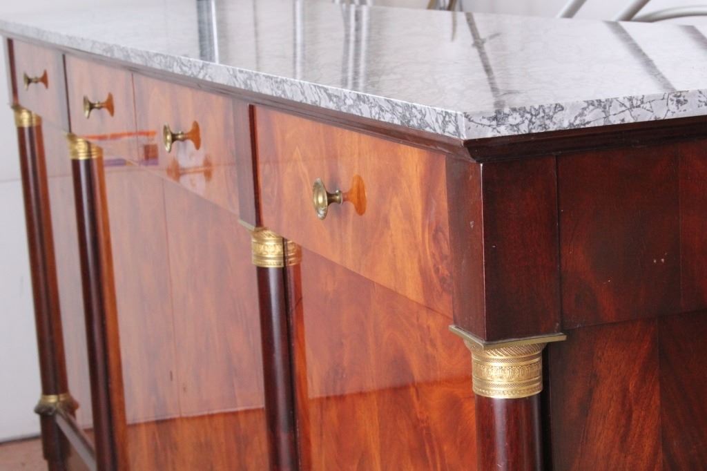 This is an Empire Style Belgium buffet side cabinet from the 19th to 20th century. The piece has the iconic Empire Style which is of the second phase of neoclassicism style. The style was created by Napoleon before and while he was Emperor of France. The pieces were made to have a style which reflected the historic Roman Empire showing brass accented pillars. The top has premium marble which is removable for transport. The feet shows slight wear, but overall a very good well-crafted and expensive piece. Measures overall 95.25"L x 22.5"D x 40.5"H. This was imported from Belgium by the owner’s family.