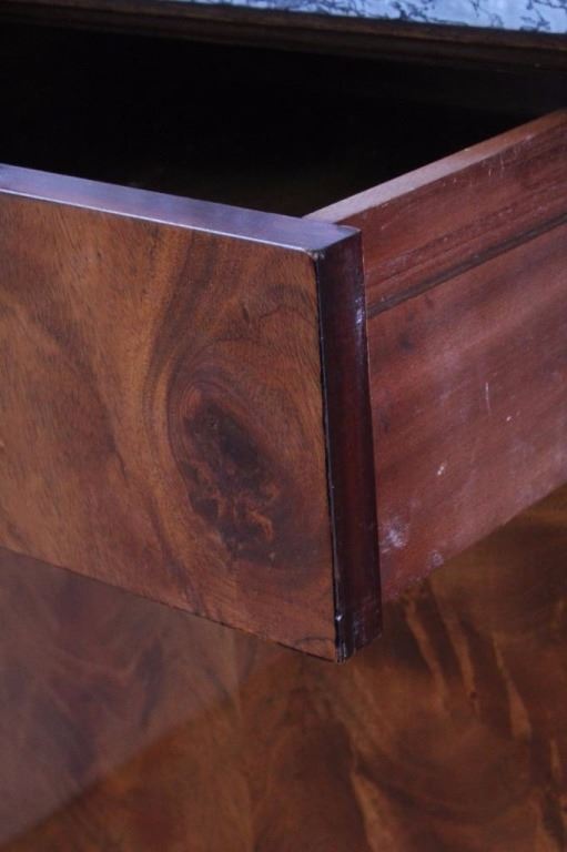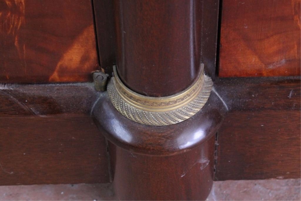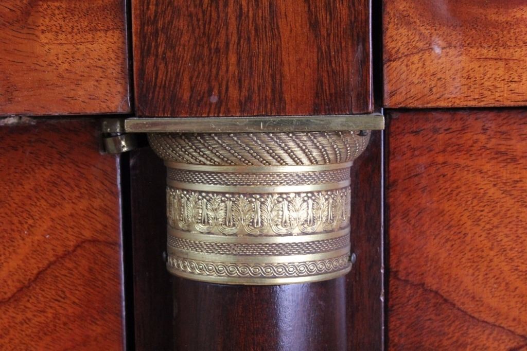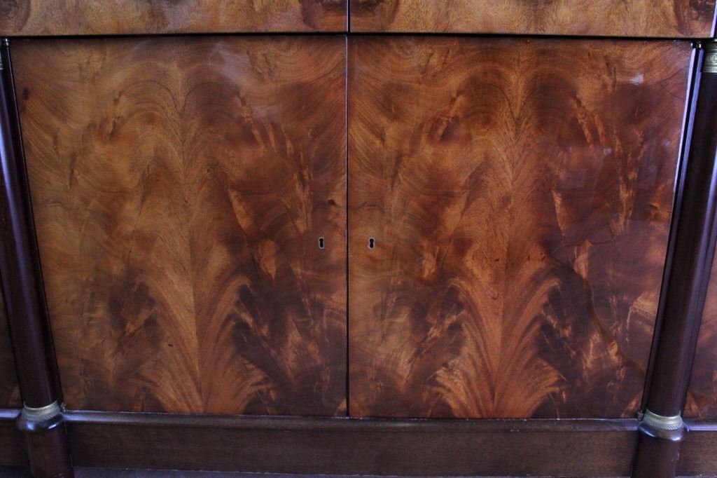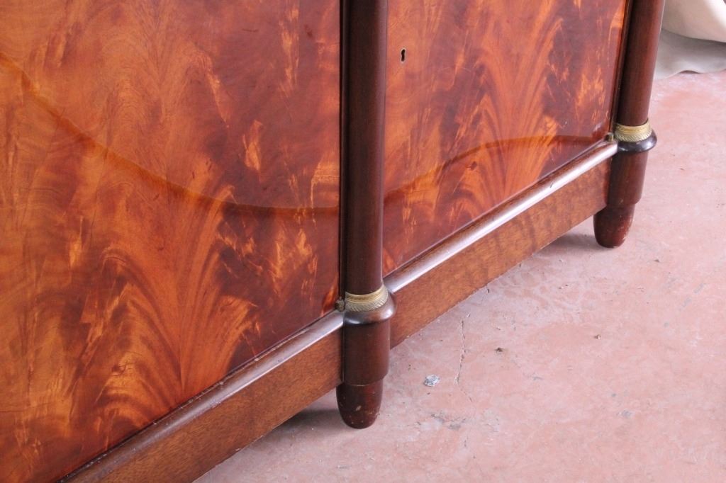 This is an Empire Style Belgium buffet side cabinet from the 19th to 20th century. The piece has the iconic Empire Style which is of the second phase of neoclassicism style. The style was created by Napoleon before and while he was Emperor of France. The pieces were made to have a style which reflected the historic Roman Empire showing brass accented pillars. The top has premium marble which is removable for transport. The feet shows slight wear, but overall a very good well-crafted and expensive piece. Measures overall 95.25"L x 22.5"D x 40.5"H. This was imported from Belgium by the owner’s family.