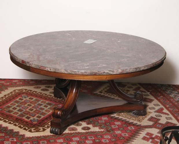 Description: Empire Style. Rouge marble top supported by upswept scroll saber supports on a tri-corner stretcher base with stylized paw feet.