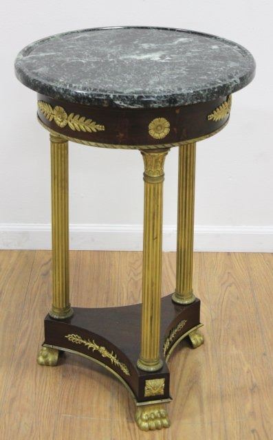 With verde antico marble top. From an Edgewater, NJ estate. Approx. 30 3/4" H x 19 3/4" diameter. Veneer chipped.