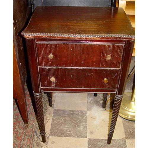 Vintage Empire style mahogany end table with a rope twist edge, spiraled legs and vertical tambour drawers.