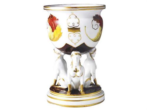 Porcelain, colour painting and gilt. Round base, three sitting sphinxes. Above them there is a sugar urn. Partly later gilt and colours. The cover is missing. Marked: striped shield under glaze blue, impressed 807. Vienna, 1807. Size: 15.5 cm