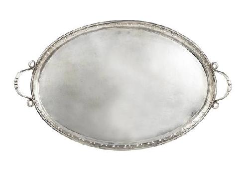 Silver, net weight 641 g. Oval form, pierced rim with foliate motif decoration, cast handles. Original wooden lining. Engraved initials of the owner: Gothic characters S H . Marked: Pest, 1818, A year letter, Pasperger, János. Brestyánszky: 124, 205, 286. Size: 37 x 23 cm