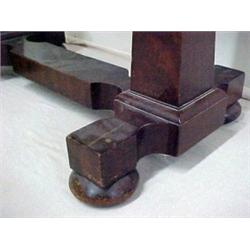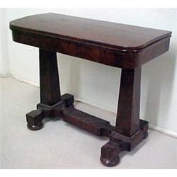 Empire game table, flame mahogany veneer, hinged top with rounded front corners, square double pedestal supports on stretcher base, bun feet, mid 19th C., 29" high x 36" across x 17" deep Estimate 200/350