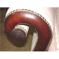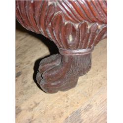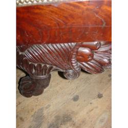 Empire mahogany sofa with claw feet. Measures 90" long, and 34" tall and 23" deep. Upholstery needs cleaning. Minor losses are visible, primarily along the back.