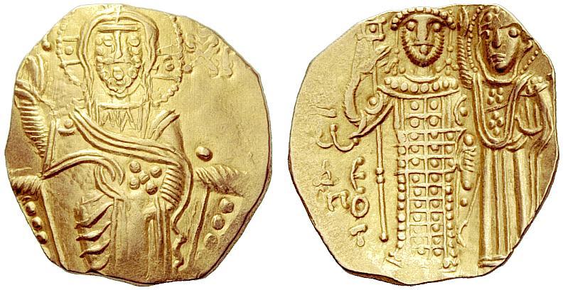 The Empire of Nicaea. John III Ducas-Vatazes, 1222 – 1254. Hyperpyron, Magnesia 1232-1254, AV 4.10 g. Christ enthroned facing, with crossed nimbus, wearing pallium and colobium, raising r. hand in benediction and holding Book of Gospels in l.; in upper field, IC – XC; pellet on r. of throne. Rev. [I& DECPOTH T& PORFVROGENNHT&] (some letters visible) Jonh, on l., standing facing and holding labarum, crowned by the Virgin; in upper field, [MHP ligate – QV]. Metcalf, Agrinion Hoard, NC 1980, cf. 215 and pl. 19, 215. DO 6b.7. Sear 2073. Slightly clipped, otherwise good very fine