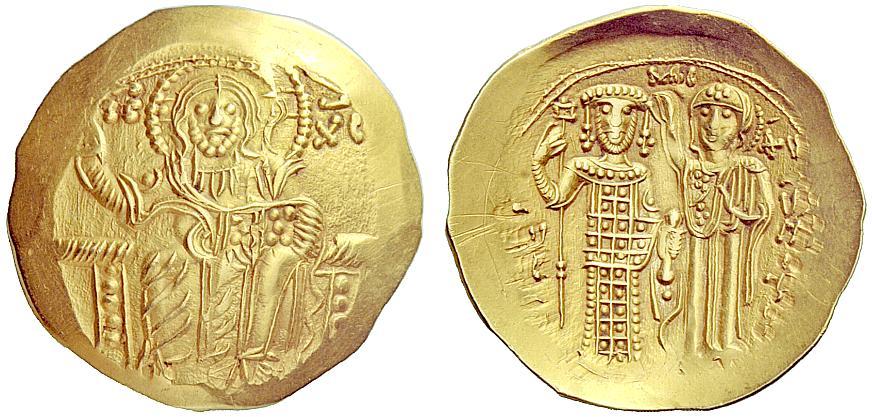 The Empire of Nicaea. John III Ducas-Vatazes, 1222 – 1254. Hyperpyron, Magnesia 1232-1254, AV 4.57 g. Christ enthroned facing, with crossed nimbus, wearing pallium and colobium, raising r. hand in benediction and holding Book of Gospels in l.; in upper field, IC – XC. Rev. [I& DECPOTH T& PORFVROGENNHT&] (some letters visible) John, on l., standing facing and holding labarum, crowned by the Virgin; in upper field, MHP ligate – QV. DO 5.9. Sear 2073. LBC –. Graffito on reverse, otherwise extremely fine