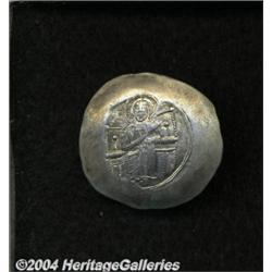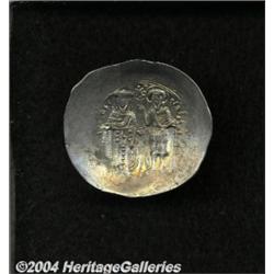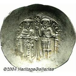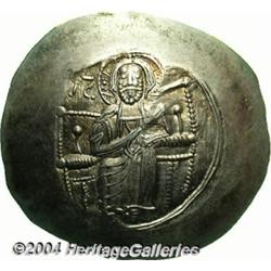 <B>Empire of Nicaea. Theodore I.</B></I> 1208-1222. AR trachy (33 mm, 4.28 g). Magnesia. Christ enthroned facing, raising right hand in benediction and holding Gospels / Theodore and St. Theodore holding star-headed staff between them. DOC 2; Hendy pl. 30, 2-3; SB 2064. Toned, Near XF. <BR><I>From the Geneva Collection.</B></I> <BR><BR><B>Important notice:</B> Heritage usually auctions material at the rate of 200-250 lots per hour. On some occasions eBay Live bid software or the Internet may not be able to keep up with the pace of the auction. We recommend placing a realistic absentee bid now as insurance to avoid disappointment. Occasionally the auctioneer may eliminate or reject an eBay Live bid, and the auctioneer may also reopen a lot after the close of the eBay live bidding (usually because we missed an audience bid), and may reject your bid even if it shows you as the winning bidder. By bidding via eBay Live, you agree that Heritage may award the lot to another bidder at its sole discretion under the circumstances described above or any other reasonable circumstances. Since eBay bids are not shown to us until we open the lot on the floor, we treat those bids just like floor bids. In most cases the floor responds before the eBay bid is presented to us, due to Internet lag time, so for consistency we have made it a policy that floor bids are always considered first over tie eBay live bids. Also please note that all Heritage lots purchased through eBay Live carry a 20% Buyer's Premium. Please make sure you read the Terms and Conditions before you bid.