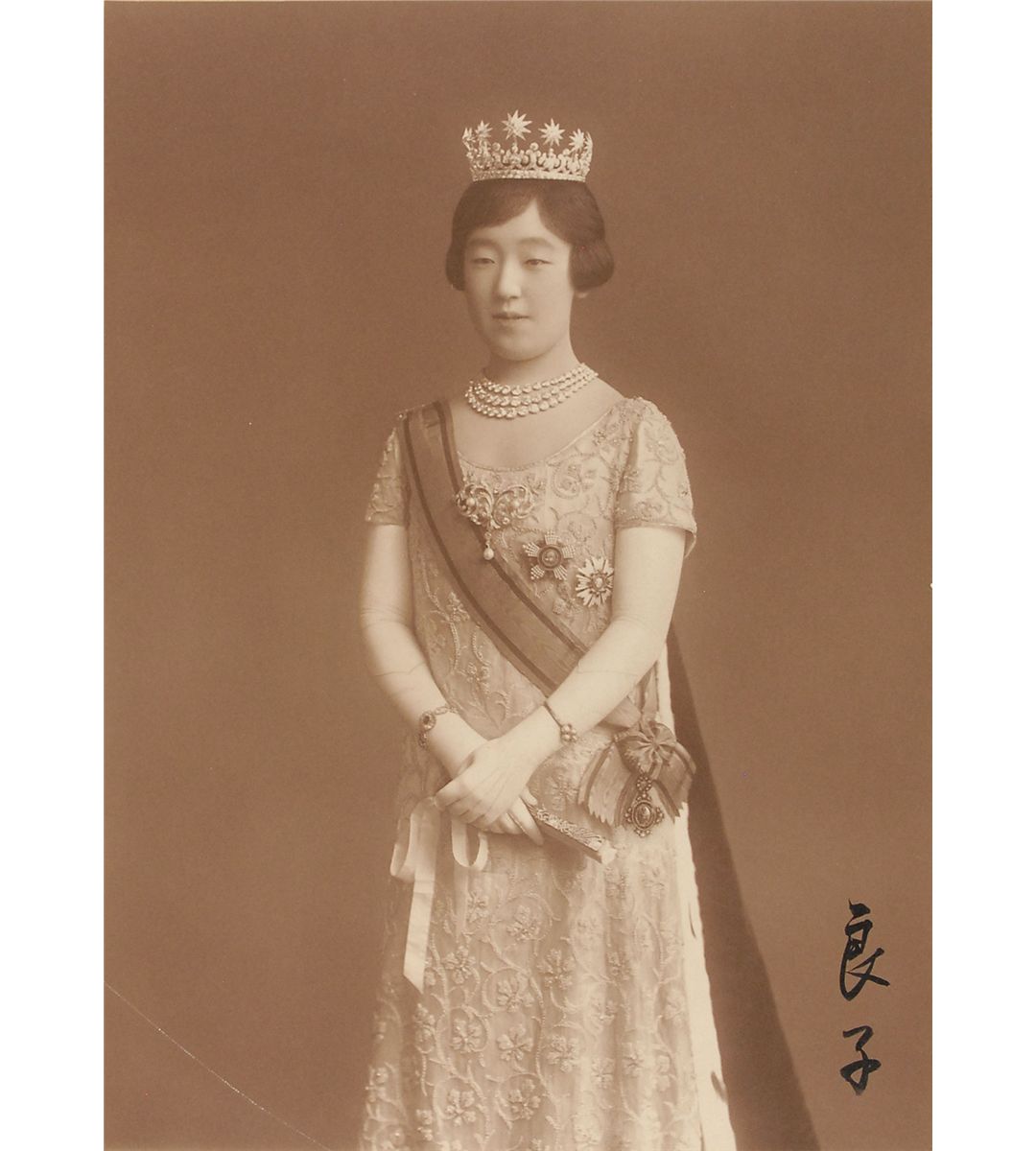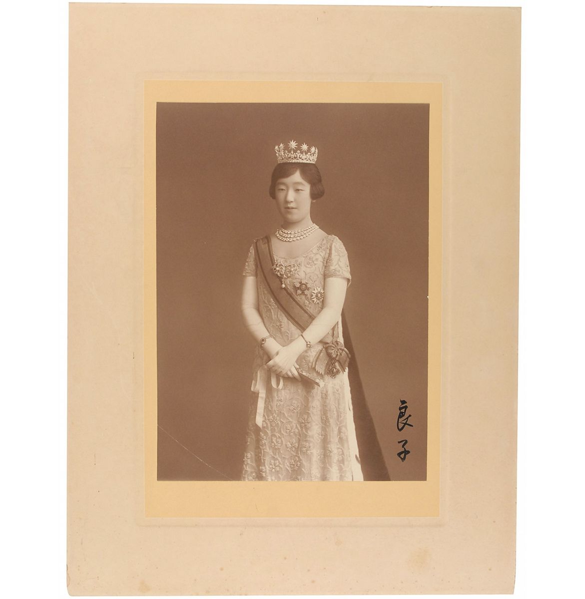 Empress of Japan (1903–2000) married to Hirohito. Extraordinary matte-finish 8 x 11 portrait of the young empress in a regal three-quarter-length pose, affixed to its original 13.5 x 17.5 mount, boldly signed in the lower right in black ink in Japanese. In fine condition, with a thin diagonal mark to the lower left corner and mild foxing and staining to the mount. It is an absolutely stunning image with deep, rich tones and exceptional clarity. Empress Kojun items are quite scarce, and this is the first time we have offered her by herself.