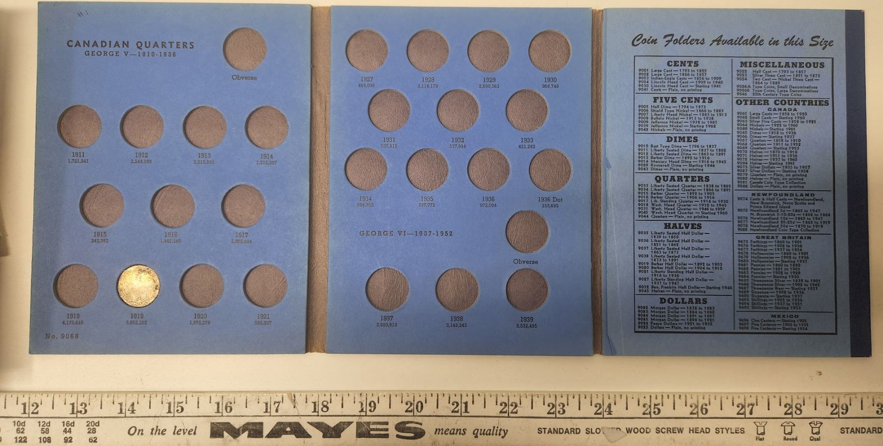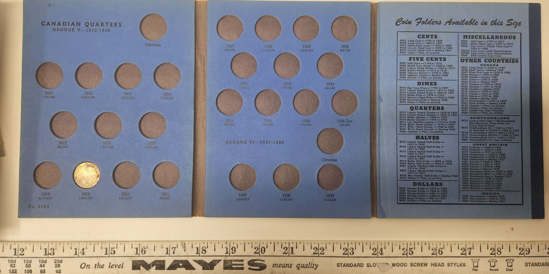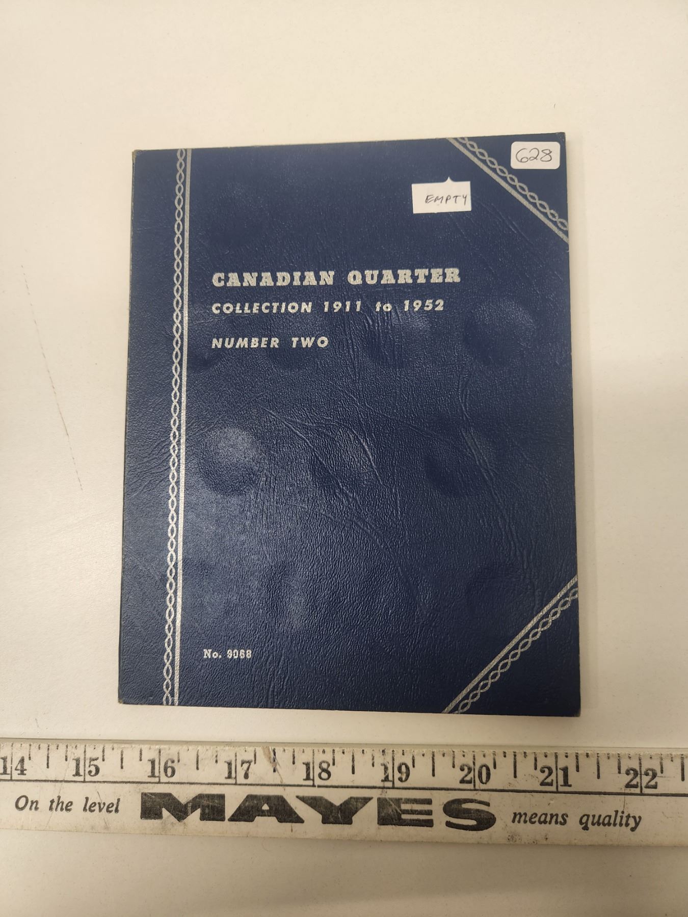 Empty Canadian 25 Cents blue Whitman folder for quarters dated 1911 to 1952. Used.