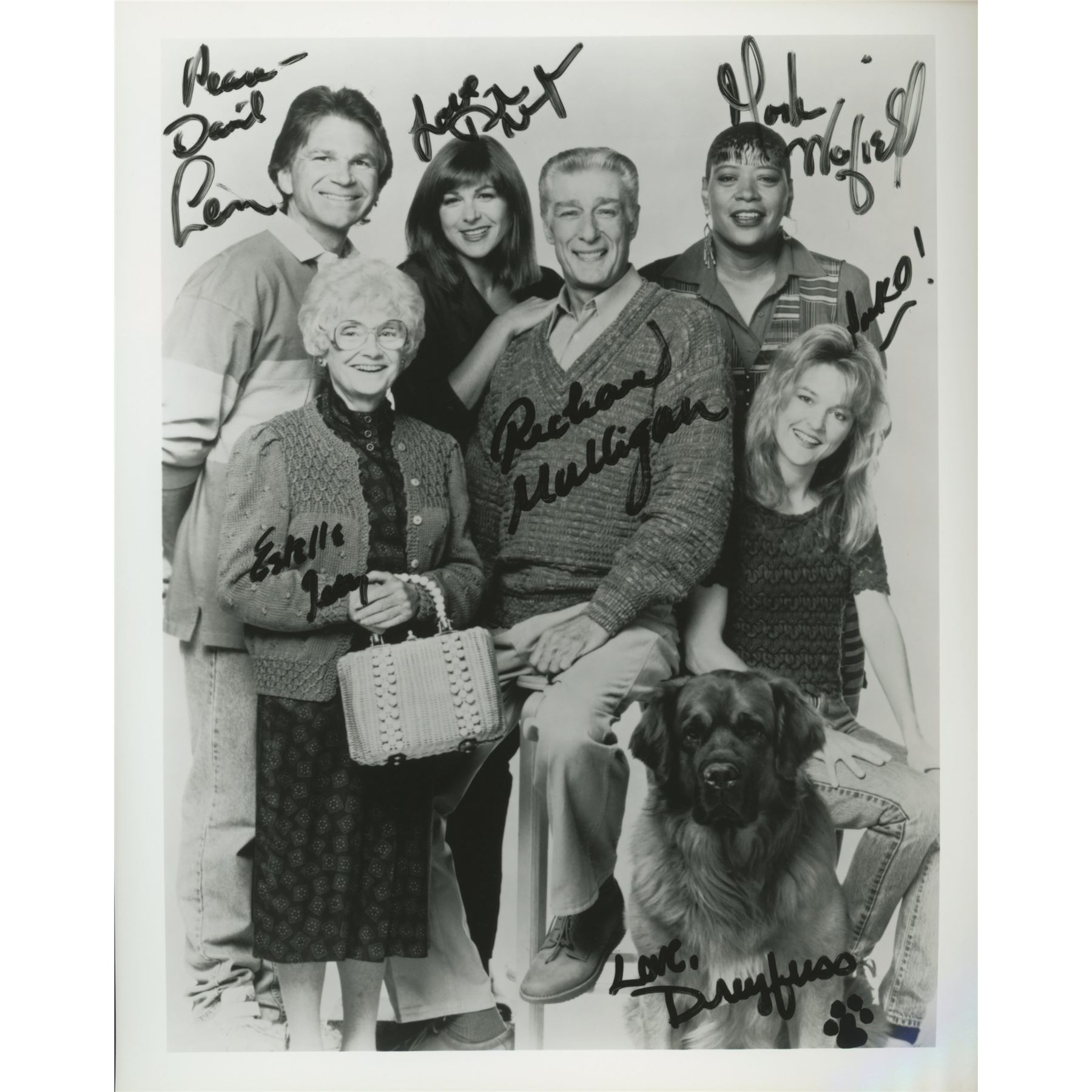 Empty Nest cast signed photo autographed by Richard Mulligan, Dinah Manoff, David Leisure, Park Overall, Estelle Getty and Marsha Warfield. 8x10 inches