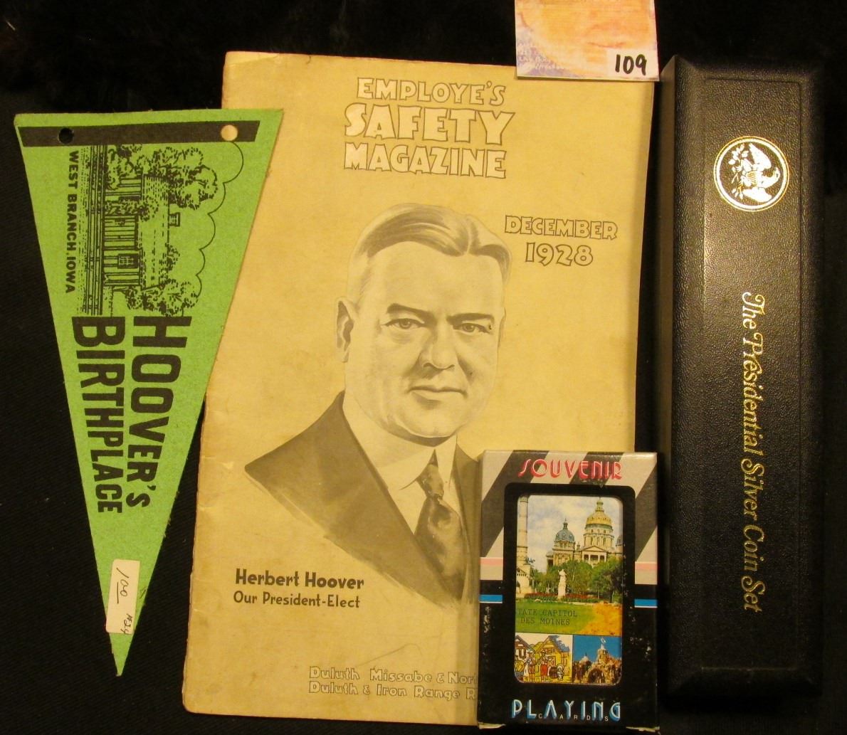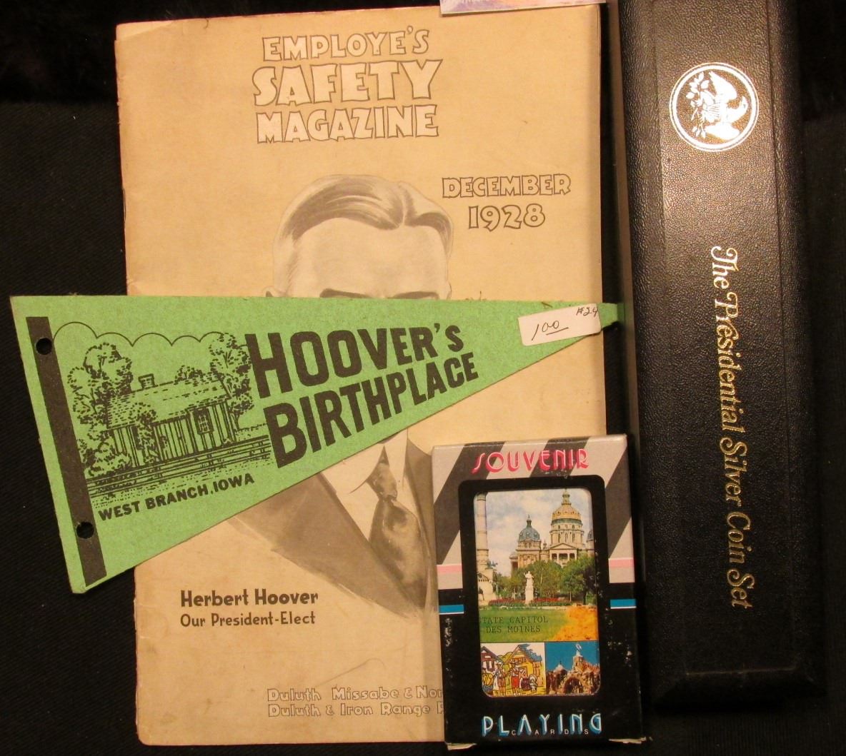 Empty plastic box titled "The Presidential Silver Coin Set"; Souvenir of Iowa Deck of playing cards in original box of issue; & December 1928 booklet "Employee's Safety Magazine Herbert Hoover Our President-Elect Duluth Missabe & Northern Ry, Duluth & Iron Range Railroad".