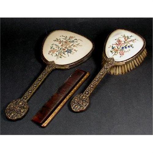 This ornate filigreed brass, silk and petit point embroidered three piece dressing table set consists of a 12 1/2 inch long hand mirror - a 10 3/4 inch long hair brush - 7 1/2 inch long comb - The mirror and brush features embroidered backs with petit point floral designs on a silk background topped with a celluloid cover protecting the silk and embroidery. They are encased in ornate brass with detailed intricate filigree designs. The natural bristles on the brush have a wood backing - the comb is encased with a patterned brass case. The set dates to the early 20th century and all the pieces, tarnished due to age, are in excellent condition.