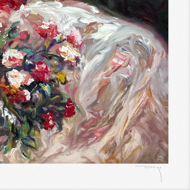 "En Flor" is a limited edition printer's proof serigraph on paper by Royo, numbered 1/7 and hand signed by the artist. Includes Letter of Authenticity. Measures approx. 34.5" x 41" (border), 28.5" x 36" (image).