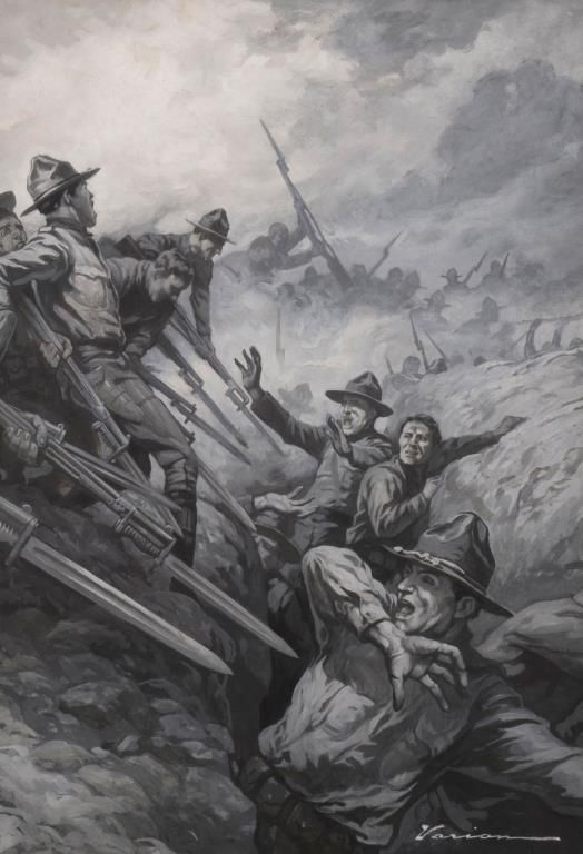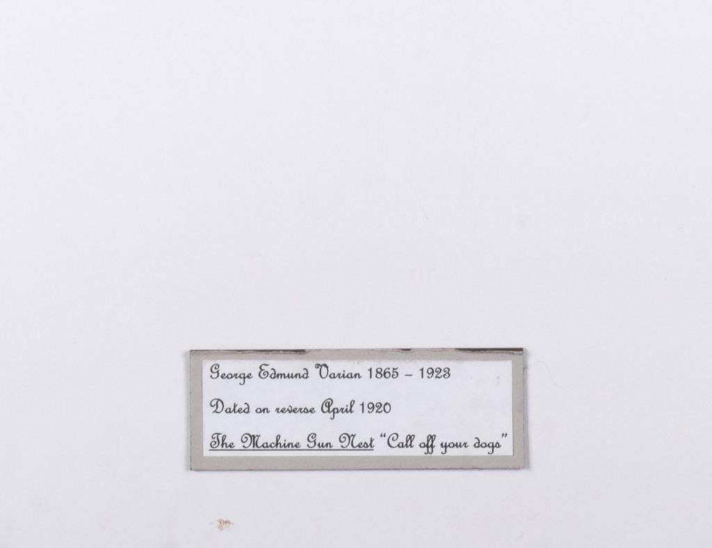 “En Griese” or black and white watercolor/gouache signed lower right “Varian” in script (George Edmund Varian (1865-1923)); dated 1920 on reverse. For article “The Machine Gun Nest” and painting entitled “Call off Your Dogs”, Marines were called “Devil Dogs” by Germans in WW I; approx. 21” x 14”, framed. Est.: $300-$600.