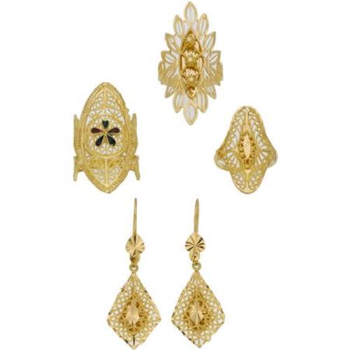 <B>Enamel, Gold Jewelry Lot</B></I><BR><BR>The lot includes: one 22k yellow gold ring of navette form, enhanced by diamond-cut patterns, further enhanced by filigree <I>(Size 6-1/4)</B></I>; one 22k yellow gold ring of navette form, designed with a floral motif, enhanced by diamond-cut patterns, further enhanced by filigree <I>(Size 7-3/4)</B></I>; one 22k yellow gold ring, centering a flower enhanced by red, blue and green enamel applied on 22k yellow gold, enhanced by diamond-cut patterns, further enhanced by filigree <I>(Size 7)</B></I>; together with a pair of earrings, suspending a drop enhanced by diamond-cut patterns, further enhanced by filigree, completed by a shepherd's hook <I>(*Note: earrings are designed for pierced ears).</B></I> Gross weight for the lot is 19.20 grams.<BR><I>*The Property of Sharon Bush</B></I> <B>Condition Report:</B> Very good condition.<BR>All of the rings are sizeable.<BR><BR><b>Shipping:</b> Miscellaneous Collectibles, Smal (<a target="_blank" href="http://www.heritageauctions.com/common/shipping.php">view shipping information</a>)