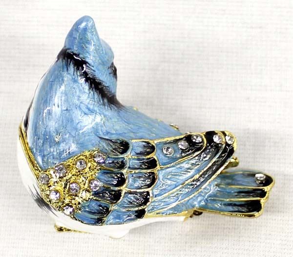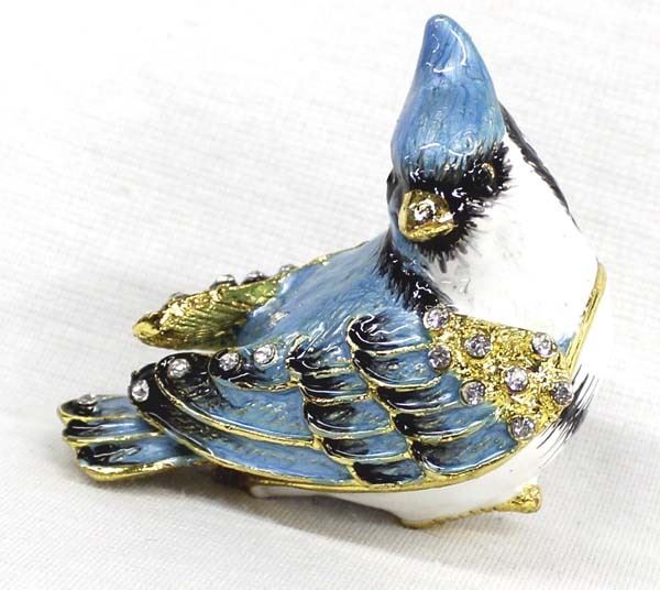 Enamel Blue Jay Trinket Box, measures 2.25''L x 2''H, enamel with rhinestone bling