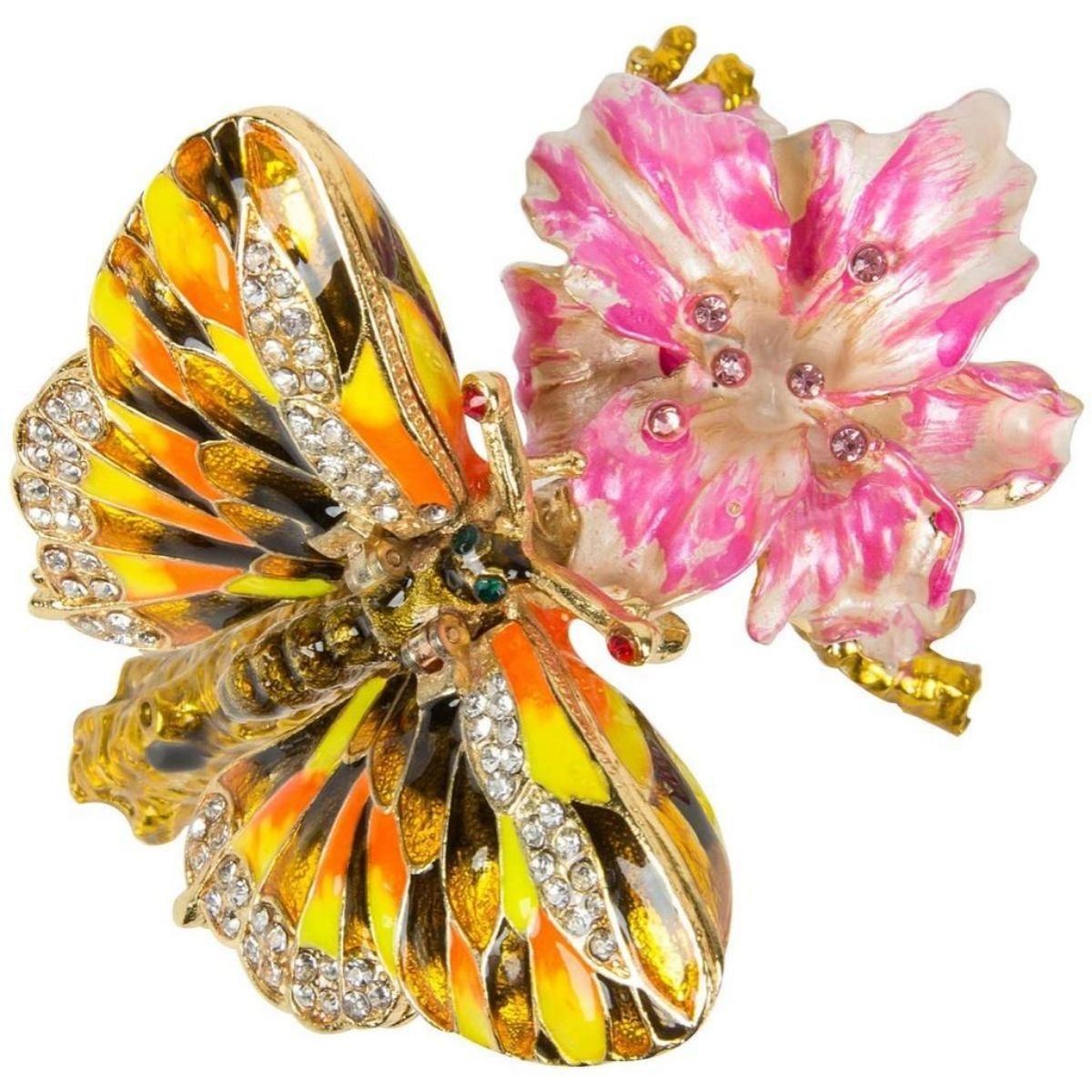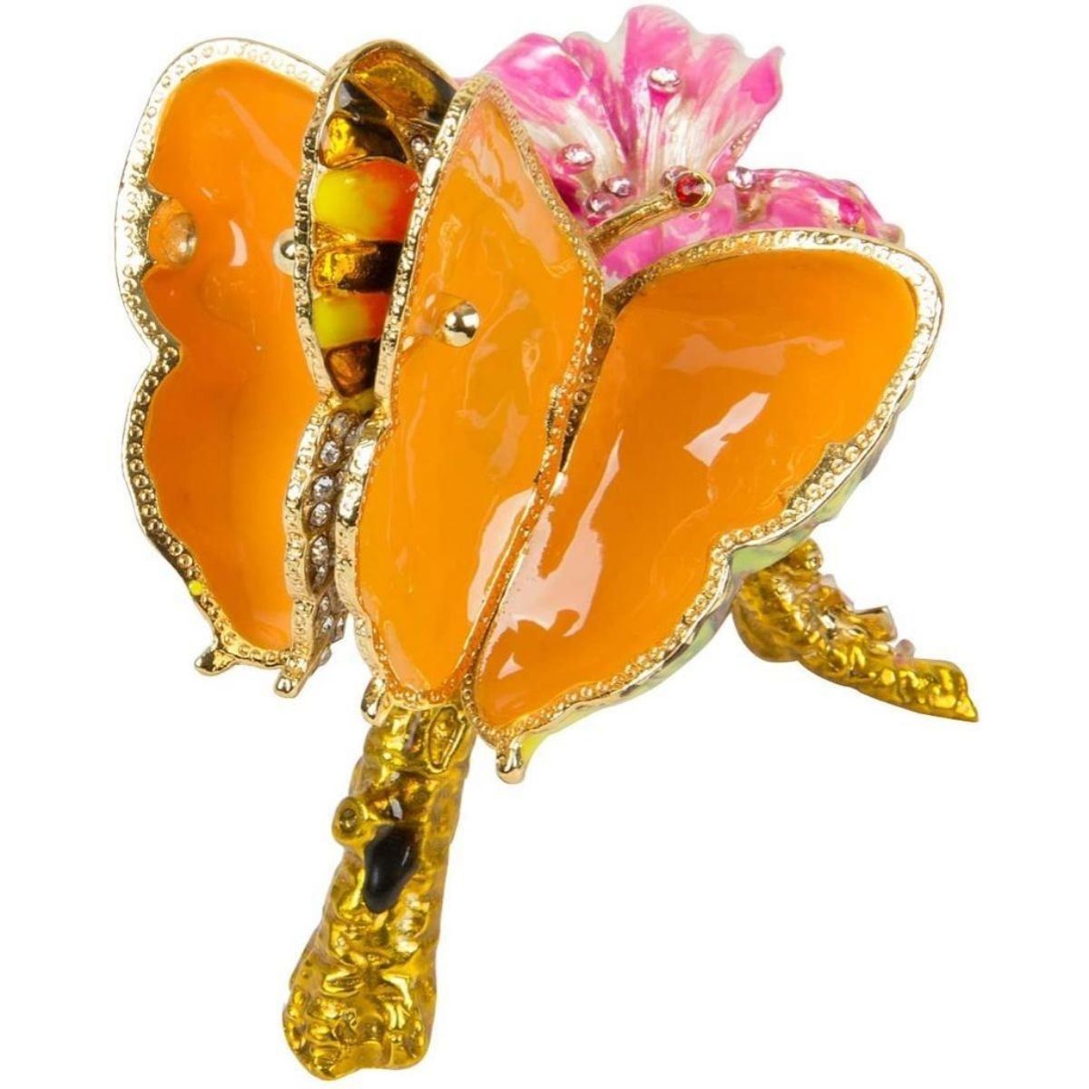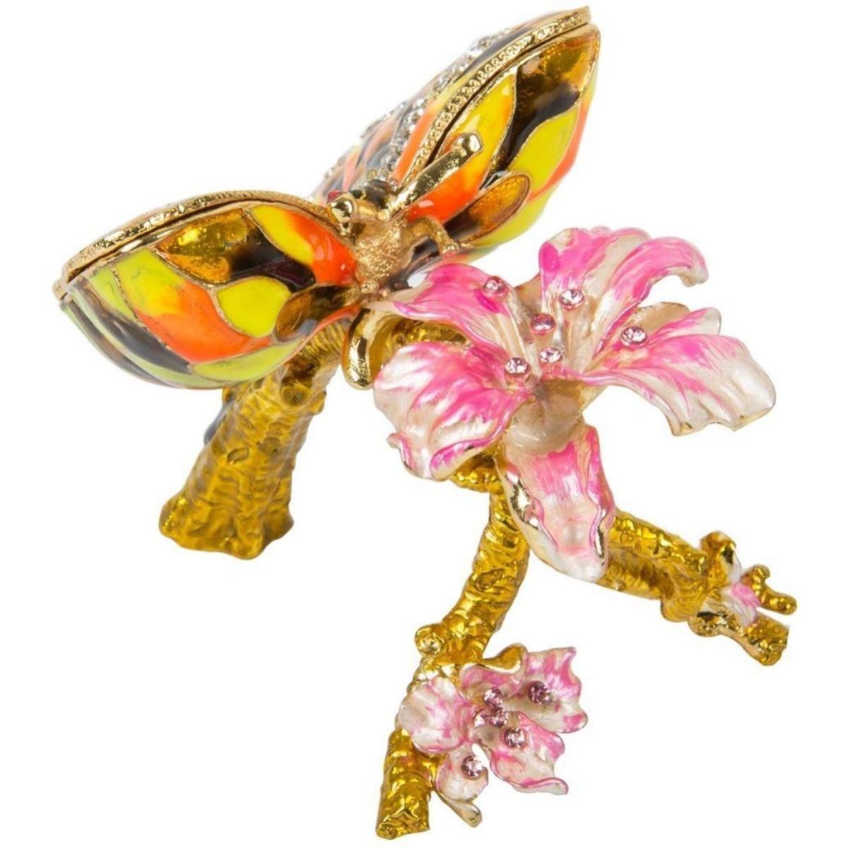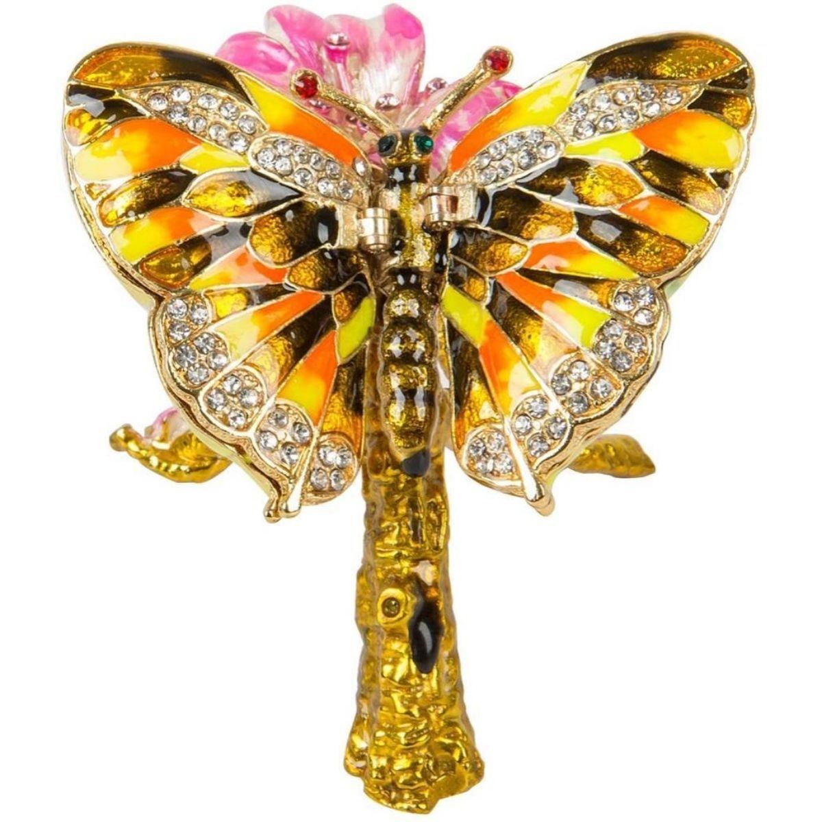 Butterfly on flower branch trinket, jewel box. Enamel & gilt over pewter, with embedded Austrian crystals. Each wing lifts up to reveal two hidden enameled compartments for storing tiny treasures. 3" H X 3" L X 2 1/2" W.
