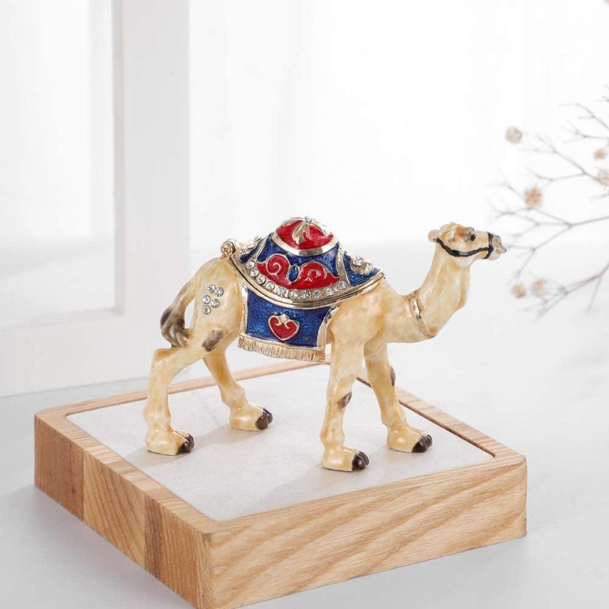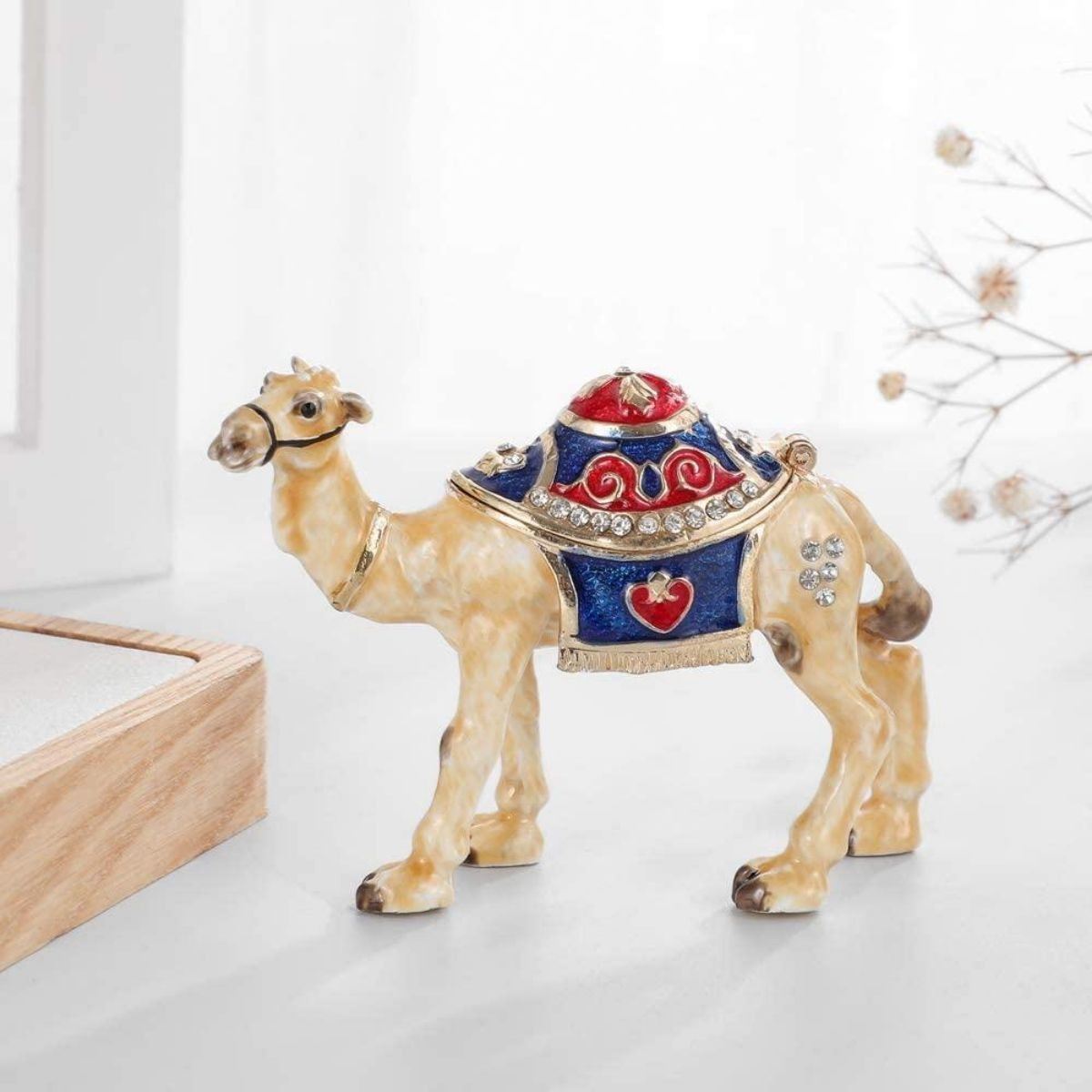 Camel trinket, jewel box. Enamel & gilt over pewter, with embedded Austrian crystals. The camel's back lifts up ( with magnetic closure ) to reveal a hidden compartment, with an enameled interior, for storing trinkets or jewels. 3" L X 1" W X 2 1/2" H.Â