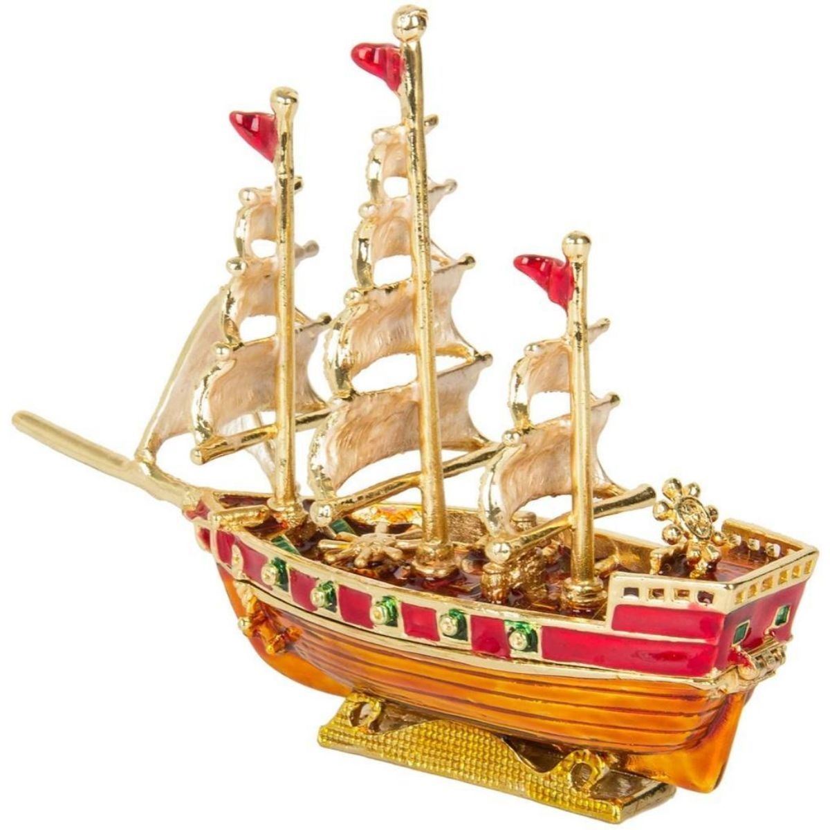 Masted sailing ship trinket, jewel box. Enamel & gilt over pewter, with embedded Austrian crystals, the top of the tiny ship lifts to reveal a hidden enamel compartment for storing trinkets or jewels. 5 3/4" H X 2" W X 4 1/2" H.Â