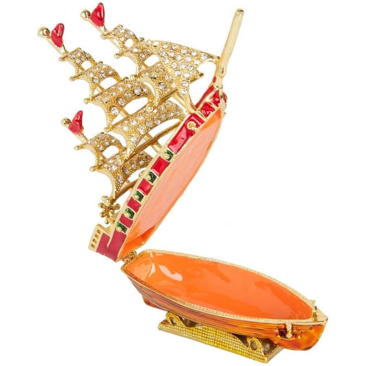 Masted sailing ship trinket, jewel box. Enamel & gilt over pewter, with embedded Austrian crystals, the top of the tiny ship lifts to reveal a hidden enamel compartment for storing trinkets or jewels. 5 3/4" H X 2" W X 4 1/2" H.Â