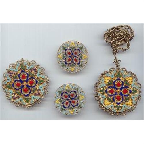 <tr><td>Title: Enamel Filigree Necklace Brooch Earrings Set </td></tr>