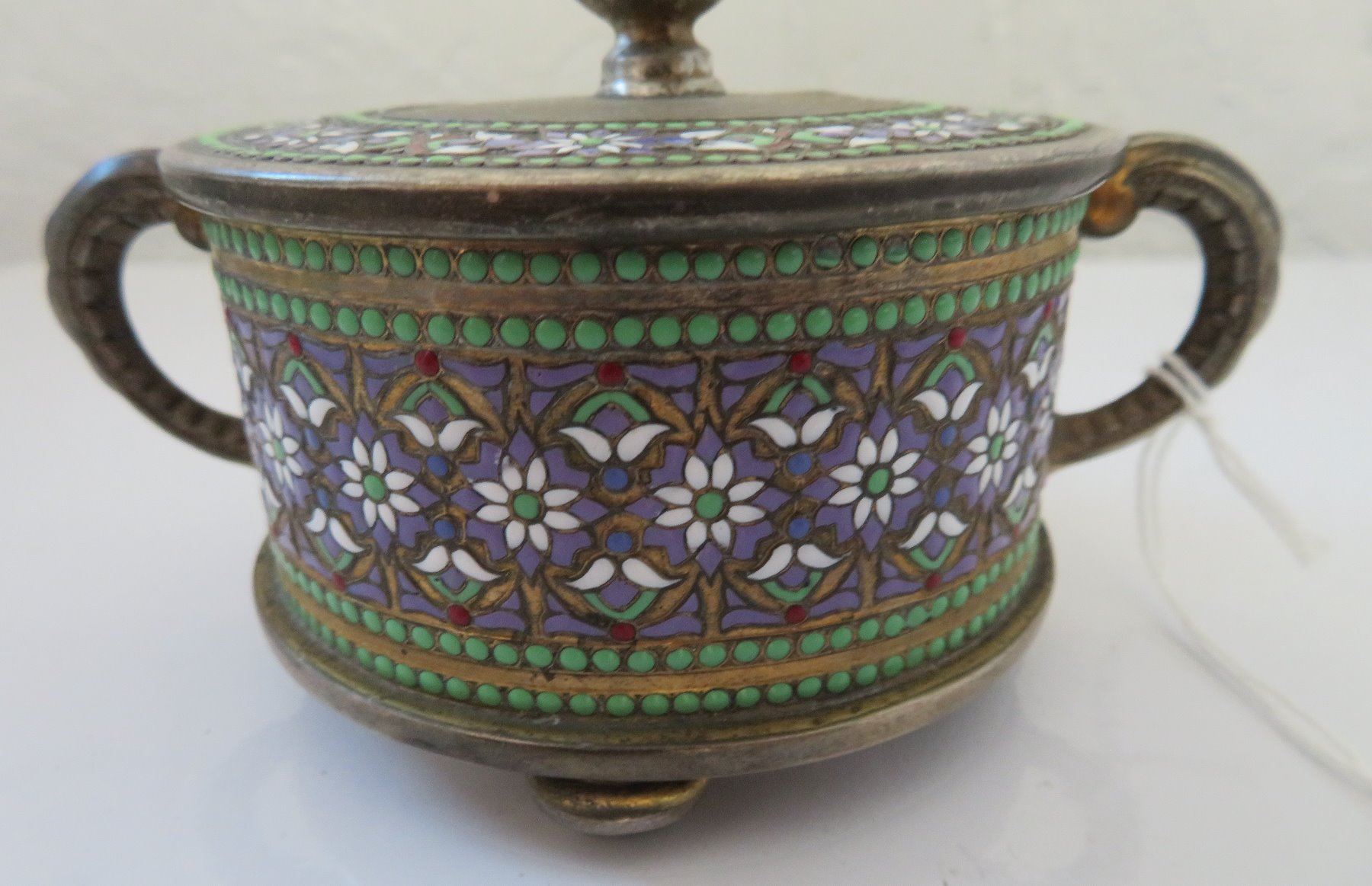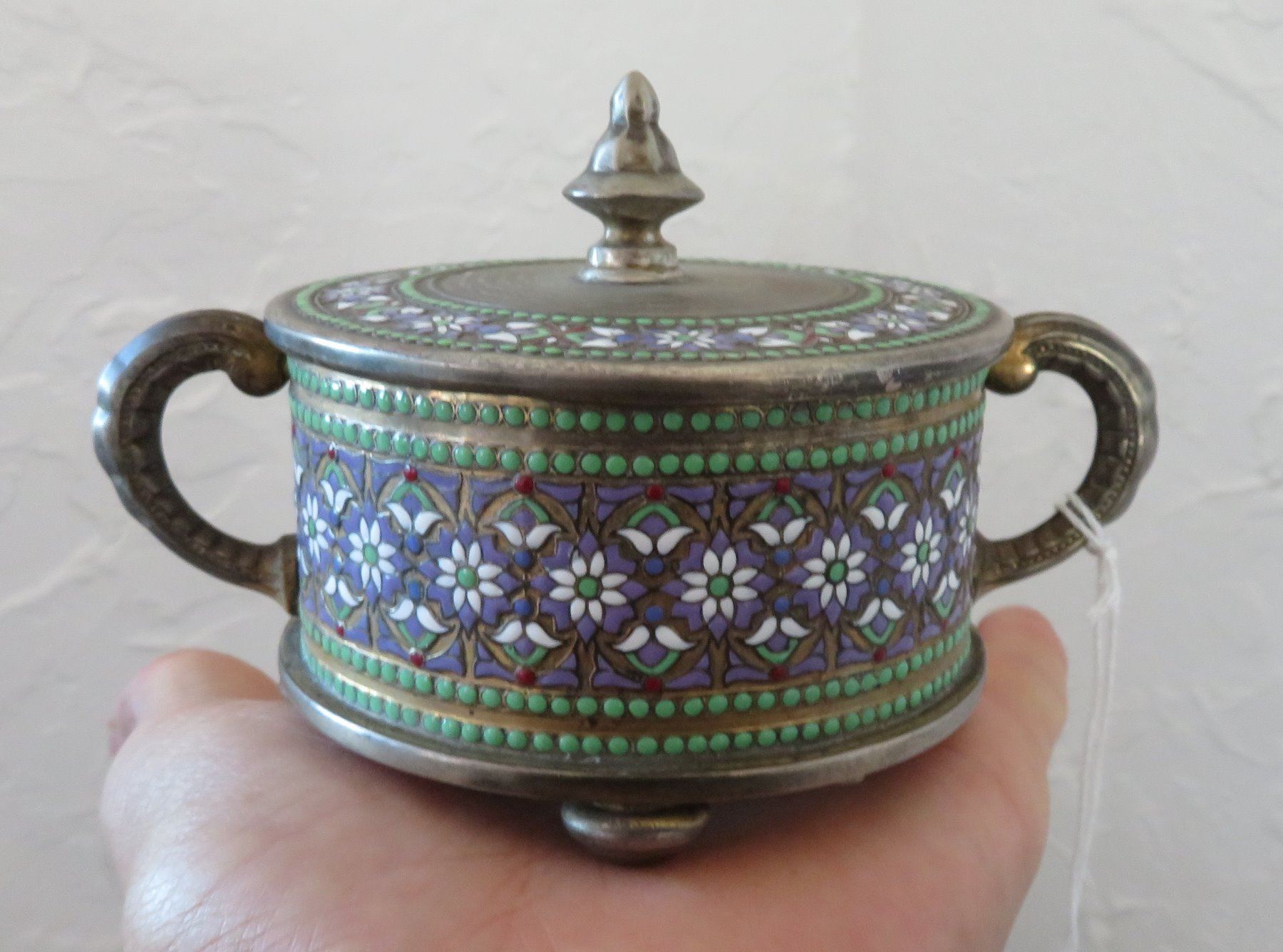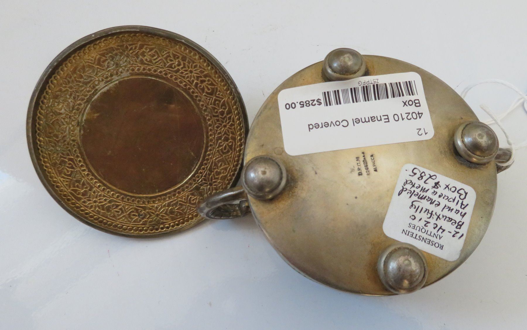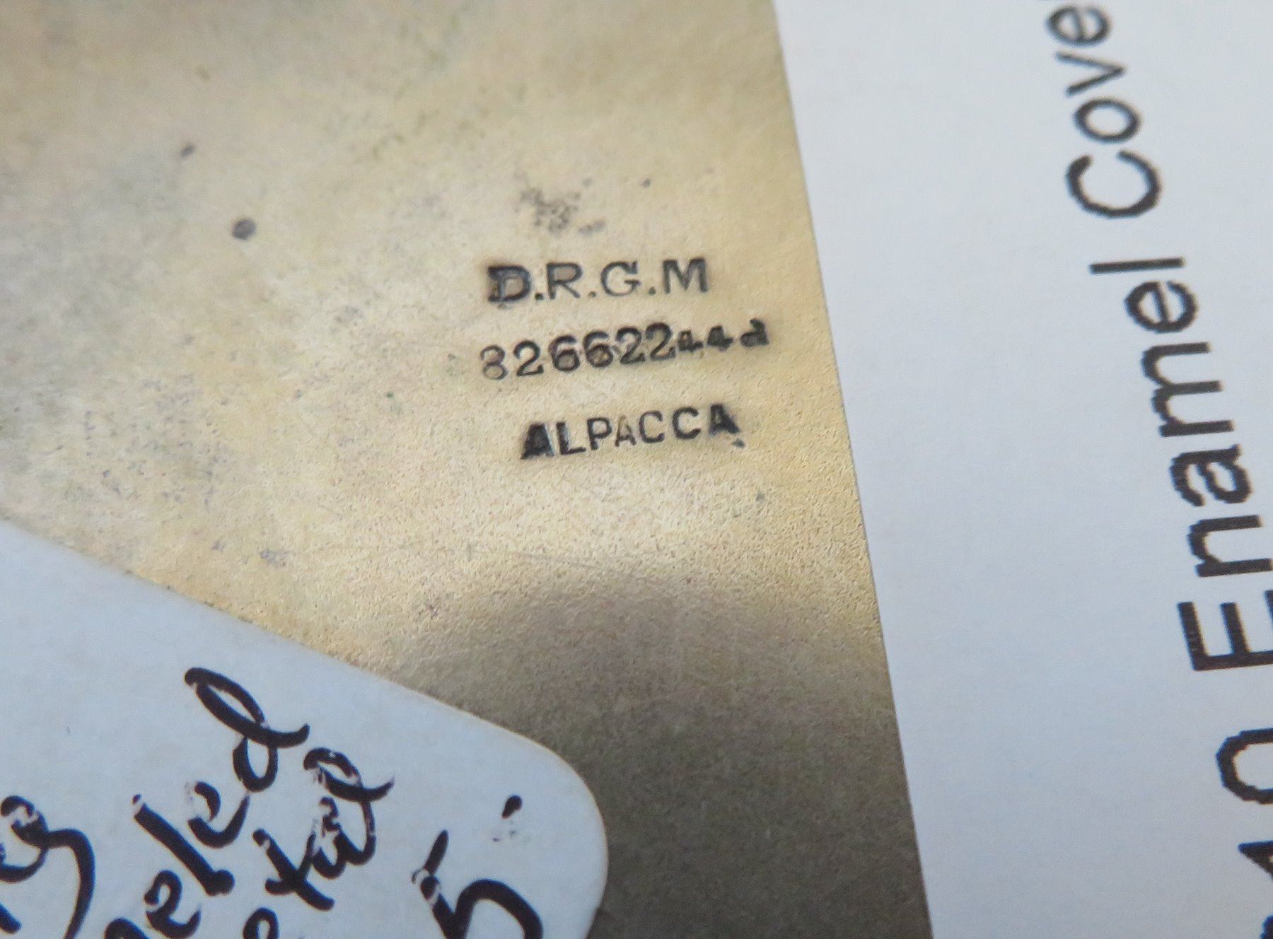 Enamel German Silver Box, c. 1940s. Made of alpaca german silver and enamel, the item measures 3 1/2" x 1 1/2" not measuring handles. German, DRGM, marked alpacca. Condition: Good, patina, see images. Shipping: $24.50 w/insurance and signature, due to value and weight.