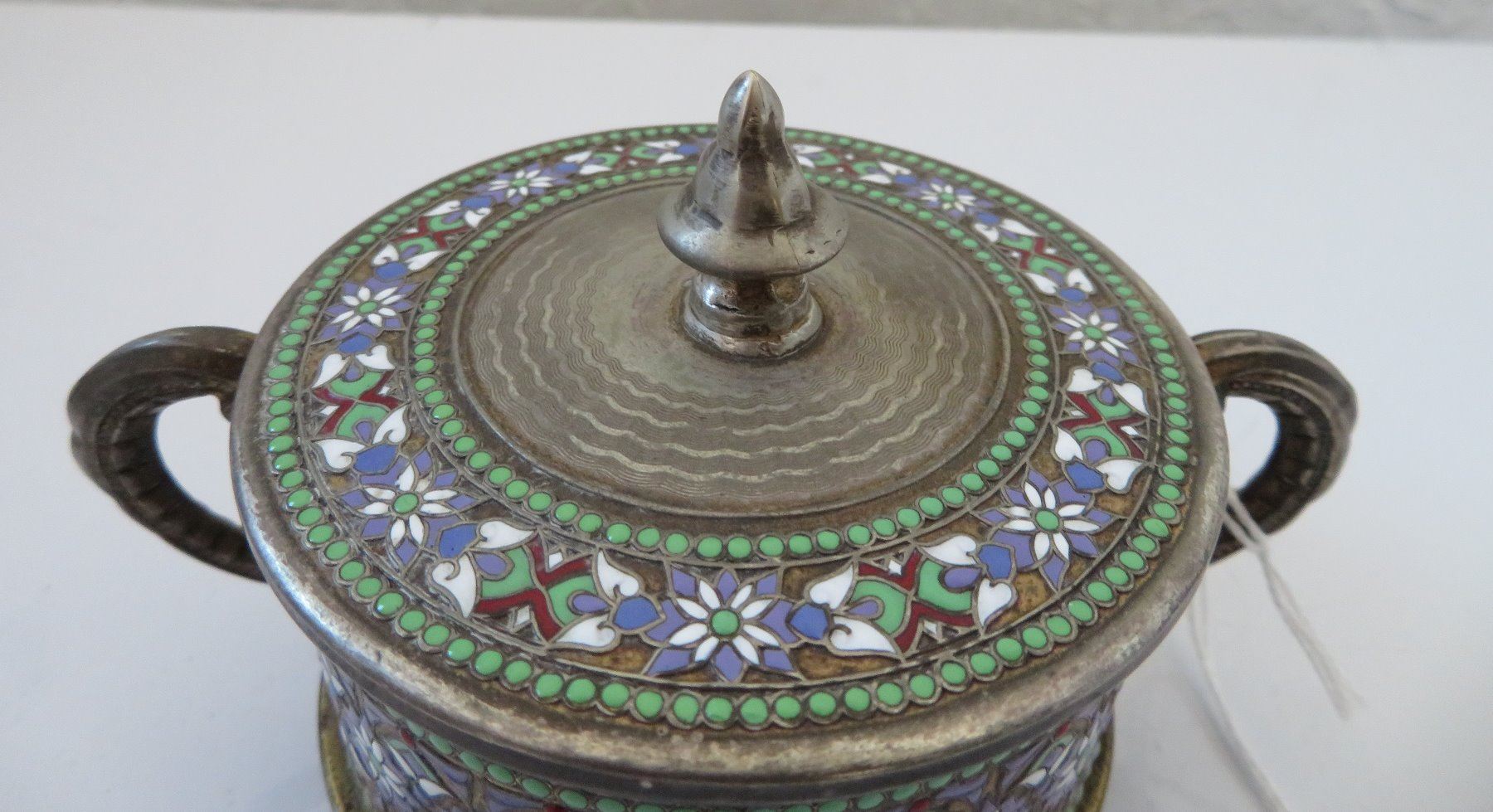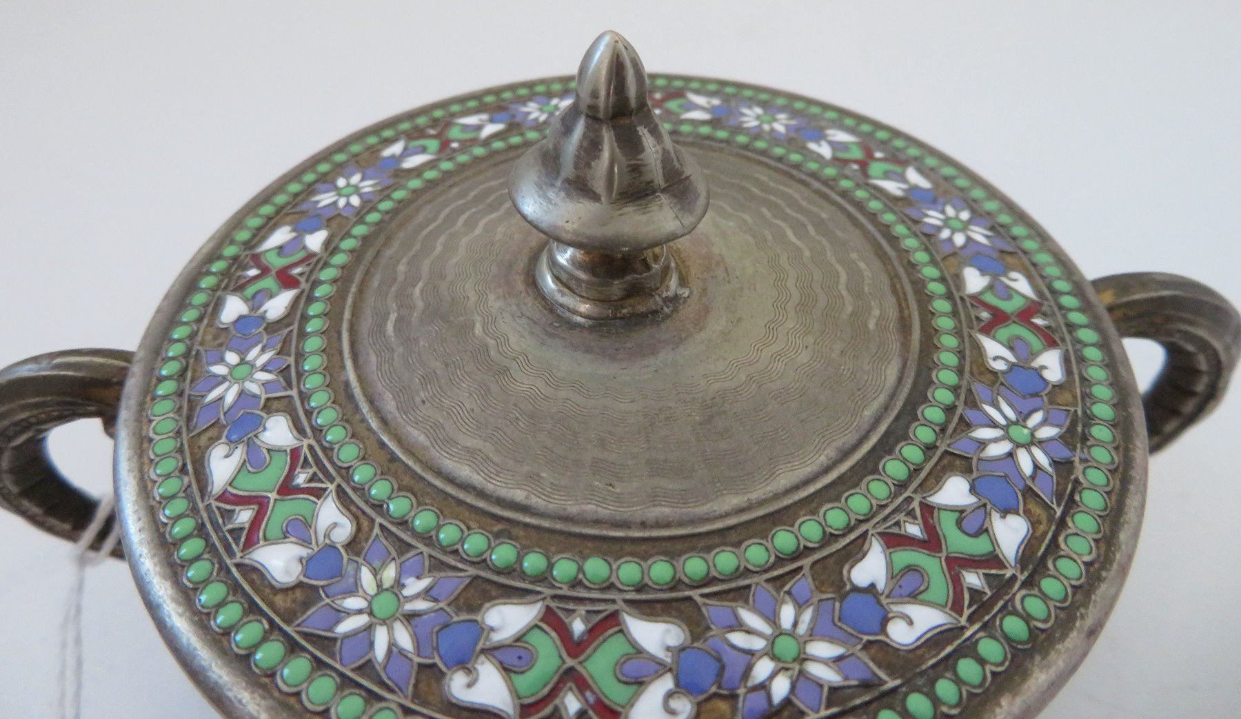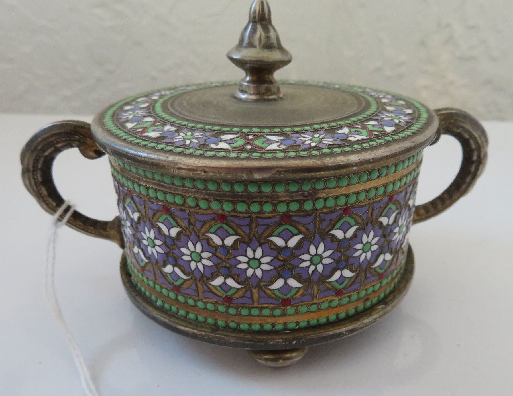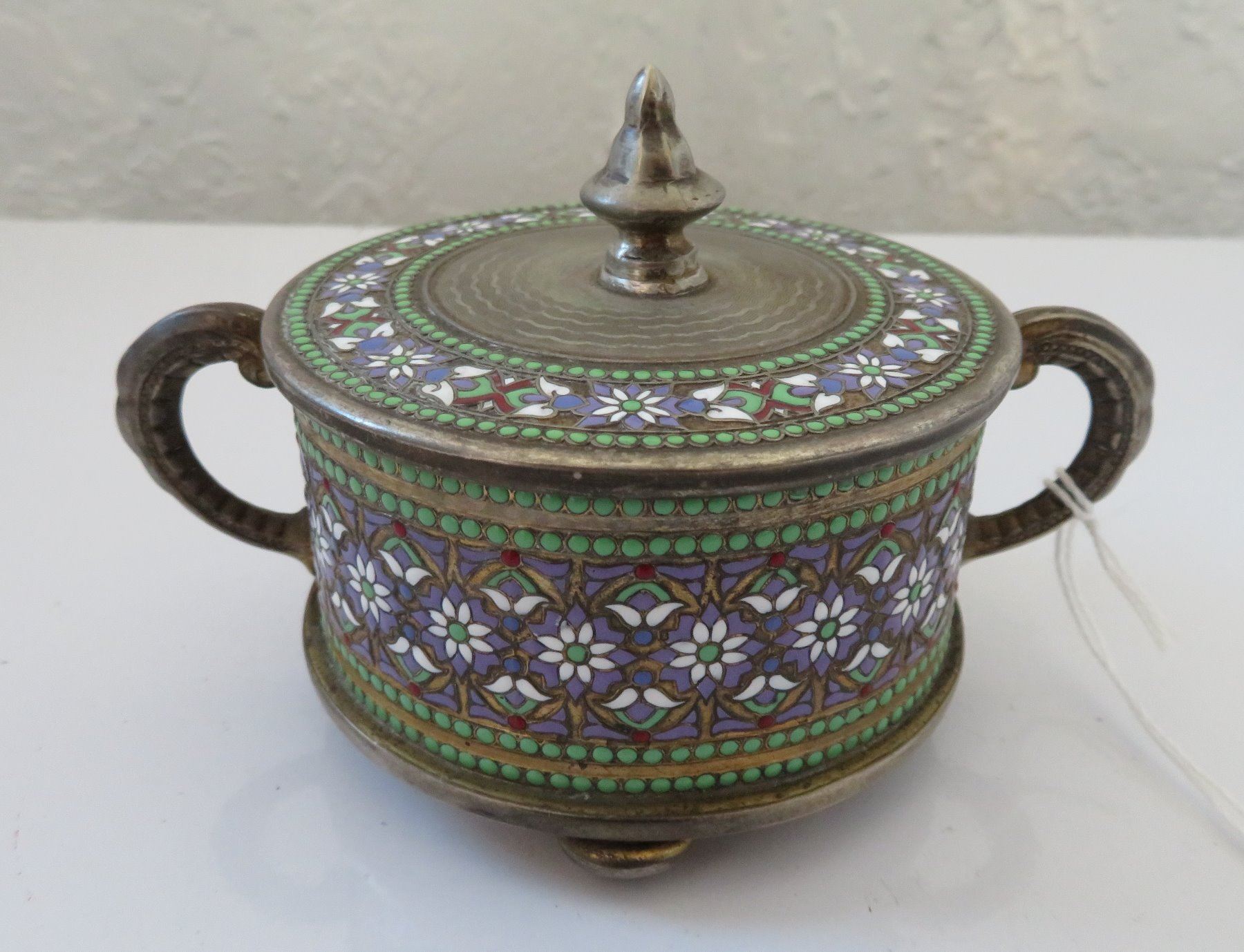 Enamel German Silver Box, c. 1940s. Made of alpaca german silver and enamel, the item measures 3 1/2" x 1 1/2" not measuring handles. German, DRGM, marked alpacca. Condition: Good, patina, see images. Shipping: $24.50 w/insurance and signature, due to value and weight.