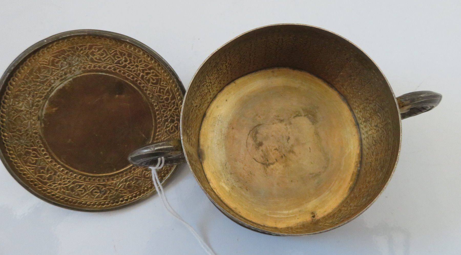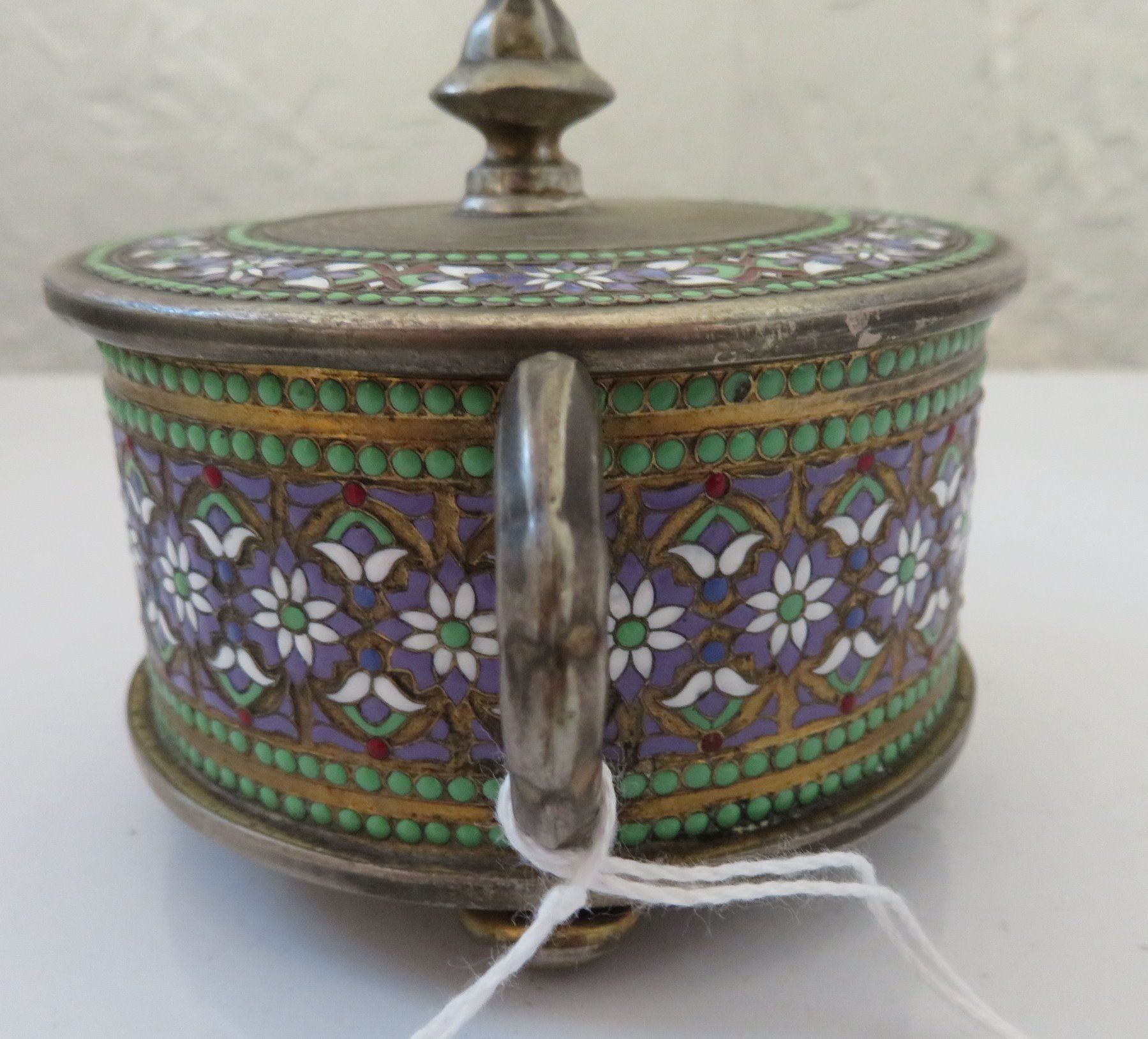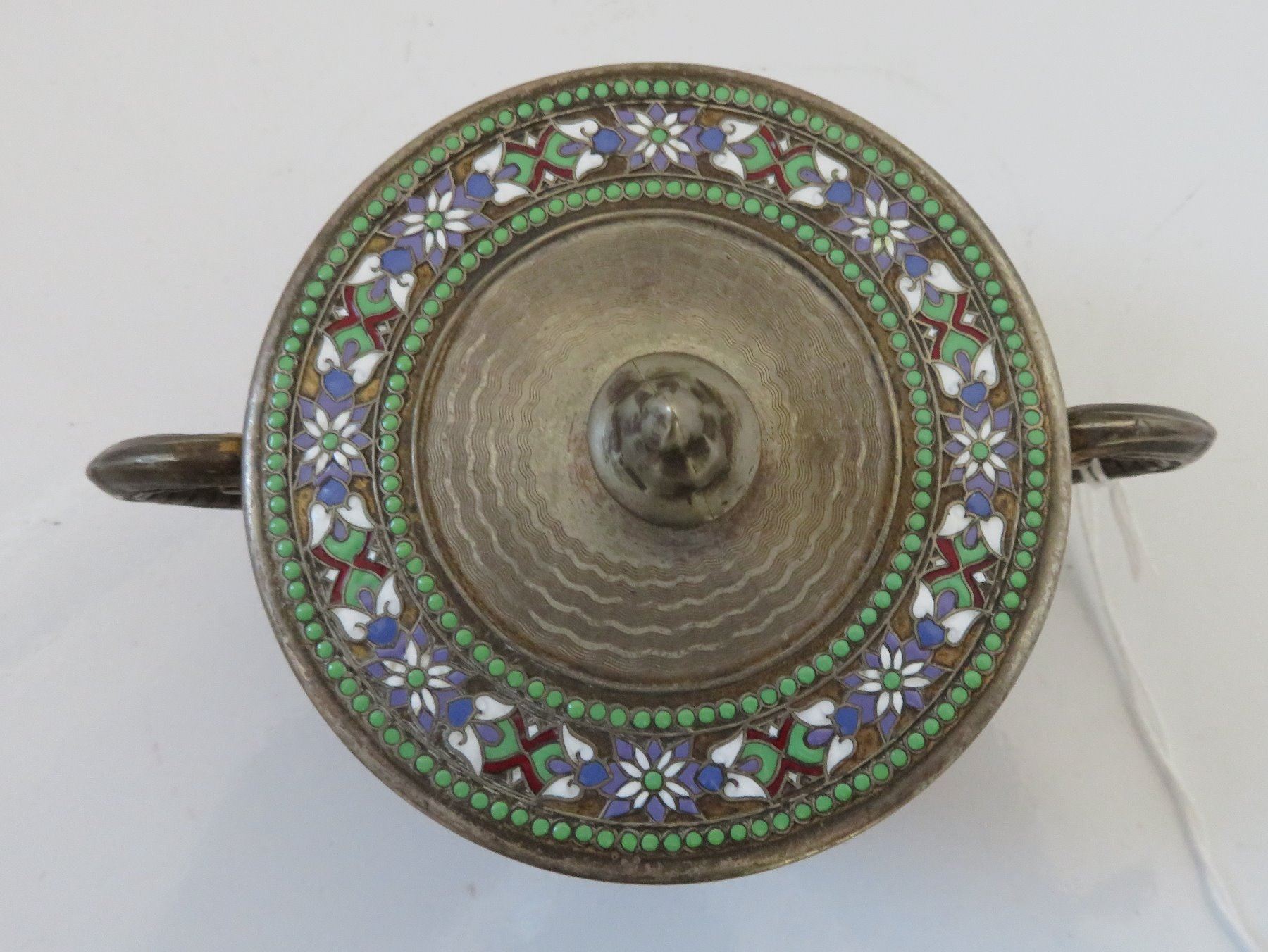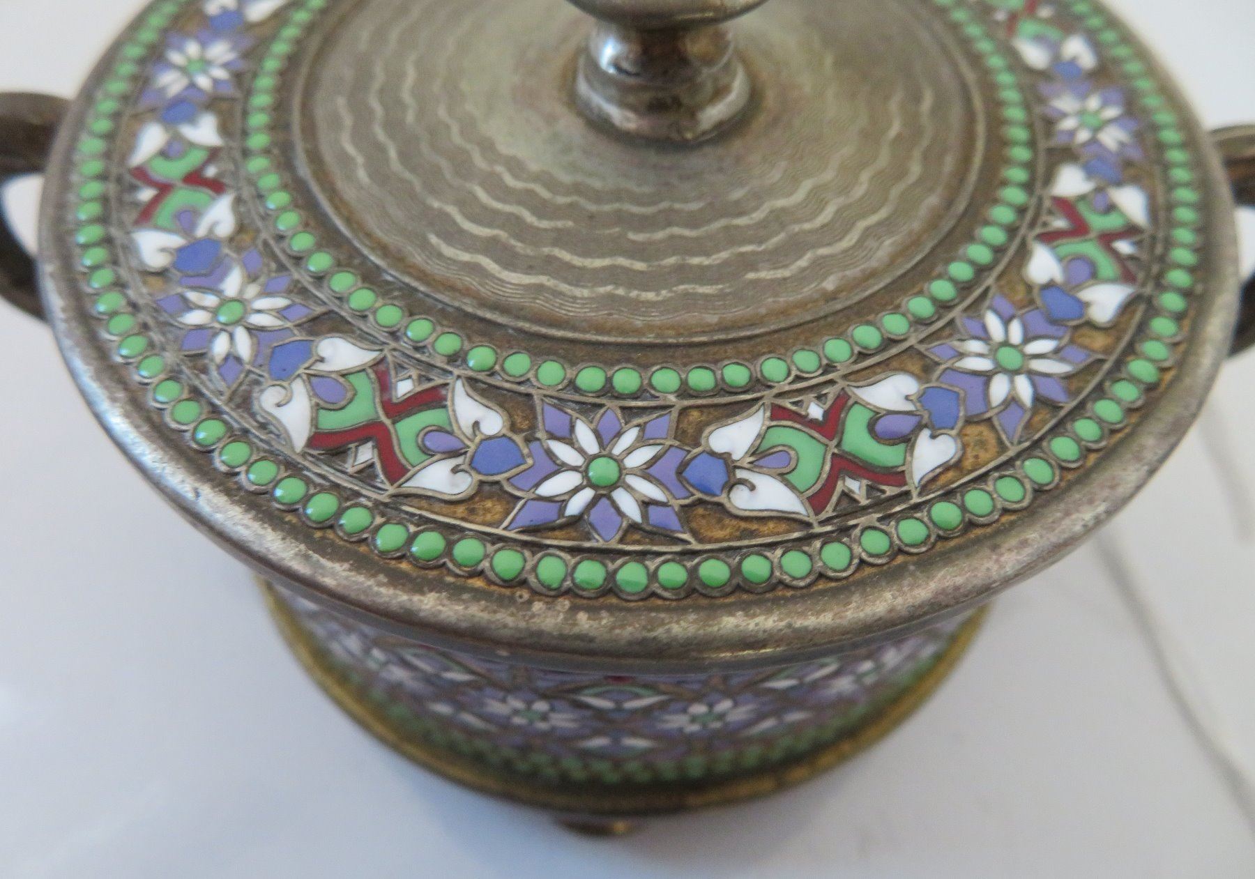 Enamel German Silver Box, c. 1940s. Made of alpaca german silver and enamel, the item measures 3 1/2" x 1 1/2" not measuring handles. German, DRGM, marked alpacca. Condition: Good, patina, see images. Shipping: $24.50 w/insurance and signature, due to value and weight.