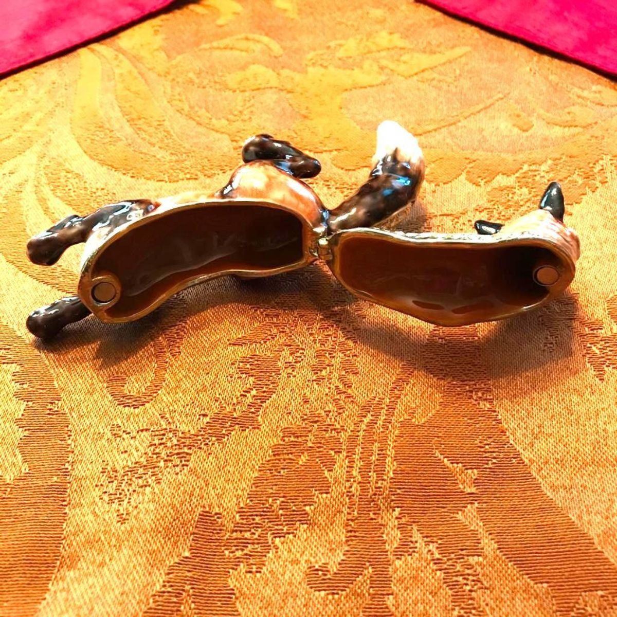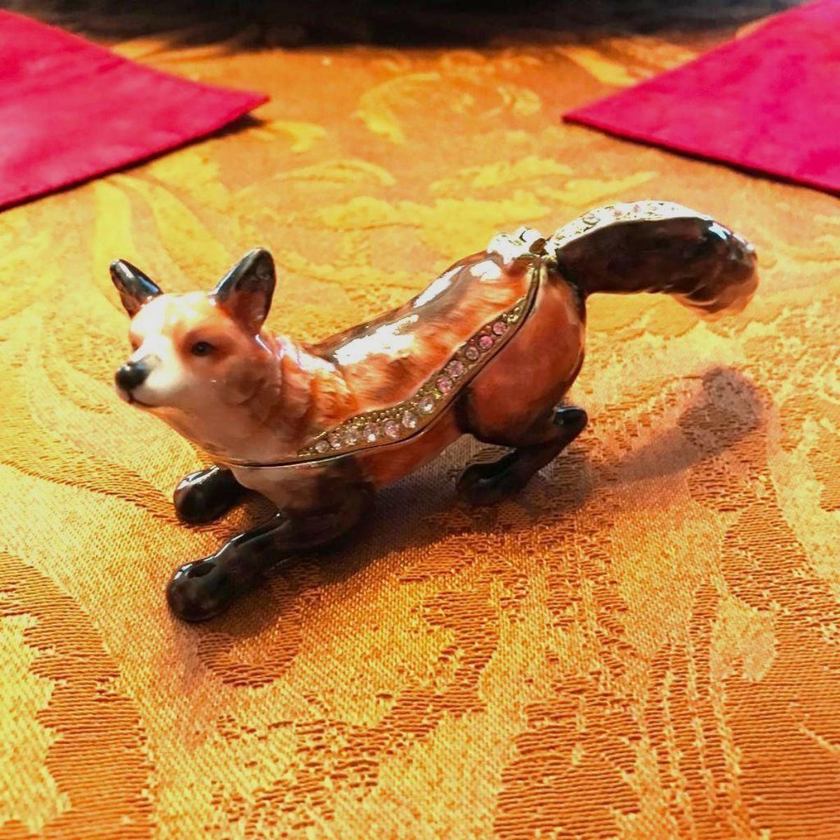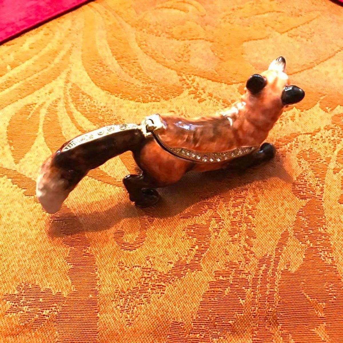 Enamel & gilt over pewter, embedded with clear Austrian crystals, trinket, jewel box, in the form of a fox. The head lifts up on a hinge, with magnetic closure, to reveal a hidden enameled interior for storing trinkets of jewels. 4 3/4" L X 1 1/4" W X 2" H. Comes with gift box.