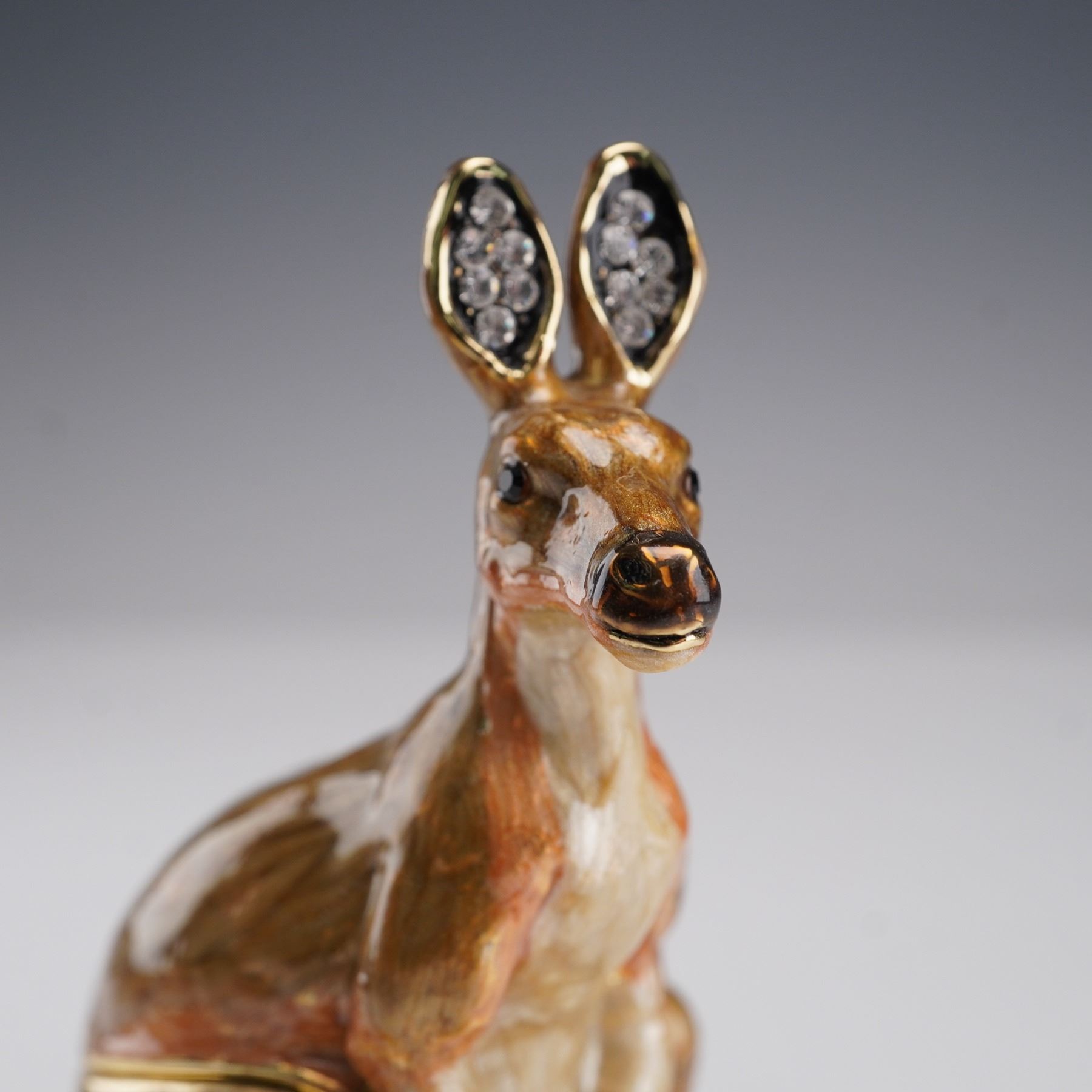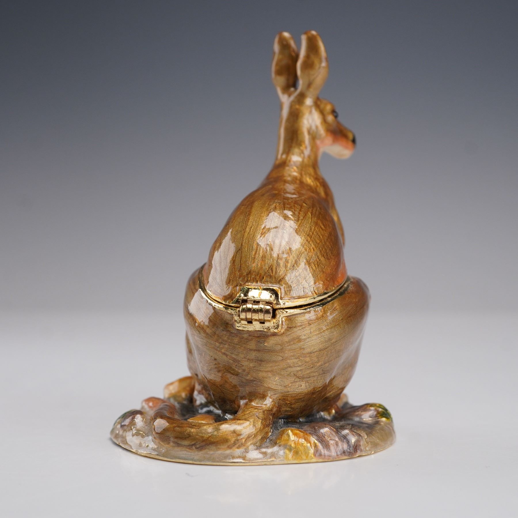 This stunning hand-painted kangaroo ring box is crafted from enamel over metal and embellished with sparkling crystals, making it a truly eye-catching piece. The kangaroo is depicted in a graceful pose, with diamond-studded ears and beautifully vibrant colors that enhance its features. The inside of the lid bears the maker's backstamp. The overall design is both whimsical and elegant, making this box a perfect addition to any collection. Its fine craftsmanship and delicate details make it not only functional but also a charming decorative piece.