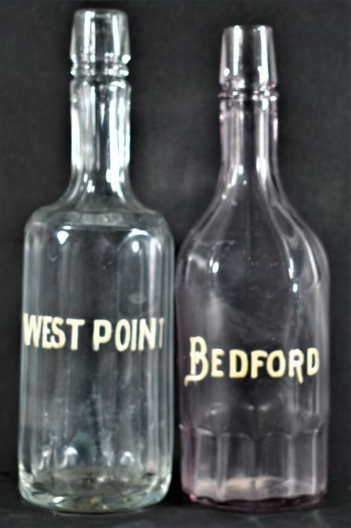 Two Enamel Label Back Bar Bottles for Bedford and West Point Whiskey. Bedford has slight nick chips at top. 11 inches tall.