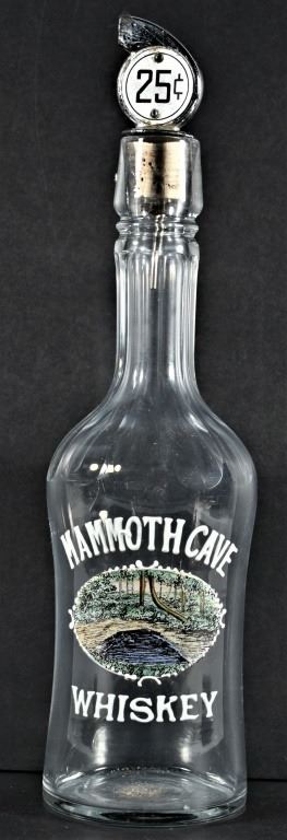 Enamel Label Back Bar Bottle for Mammoth Cave Whiskey. Image of cave on front of bottle. Comes with 25 cent shot topper. No chips or cracks. 11 1/4 inches tall w/o stopper.